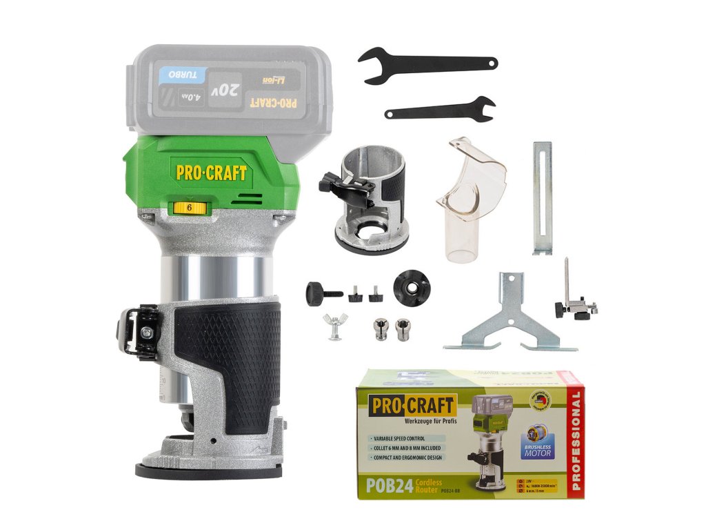 Aku frézka horní Procraft POB24 bb – výkonný stroj s bezuhlíkovým motorem, regulací otáček (16 000–35 000 ot./min) a kleštinami 6/8 mm.