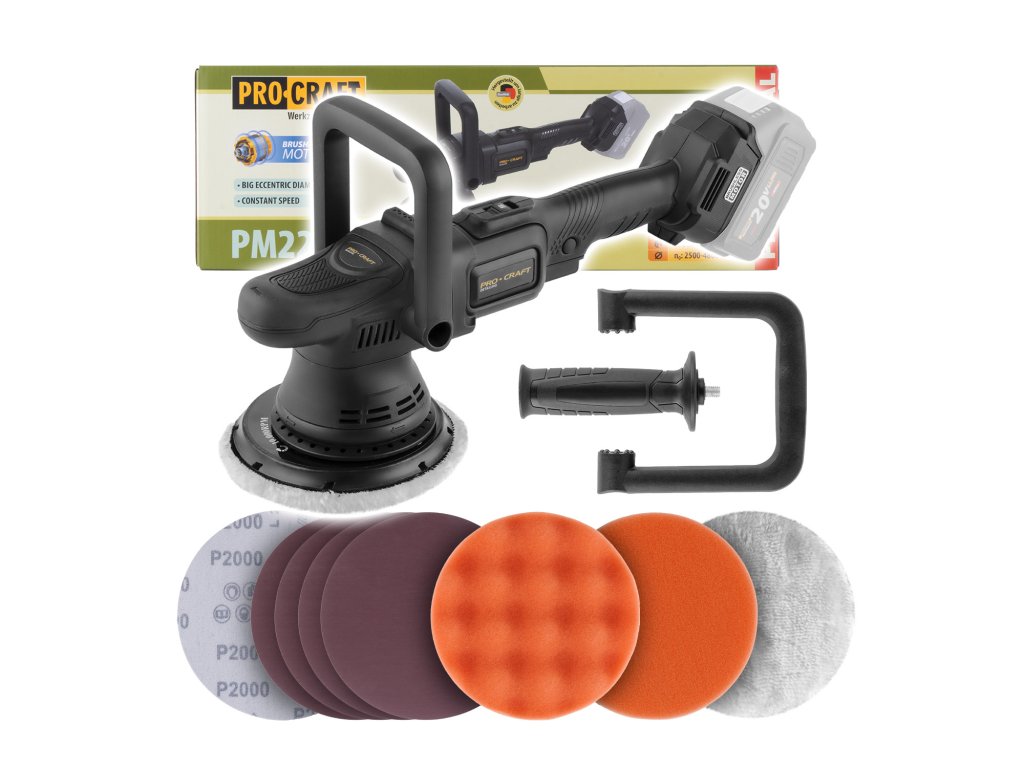 Procraft PM22bb je lehká, dobře ovladatelná a výkonná orbitální leštička vhodná pro domácí i hobby detailing, renovace laků a běžnou údržbu povrchů.