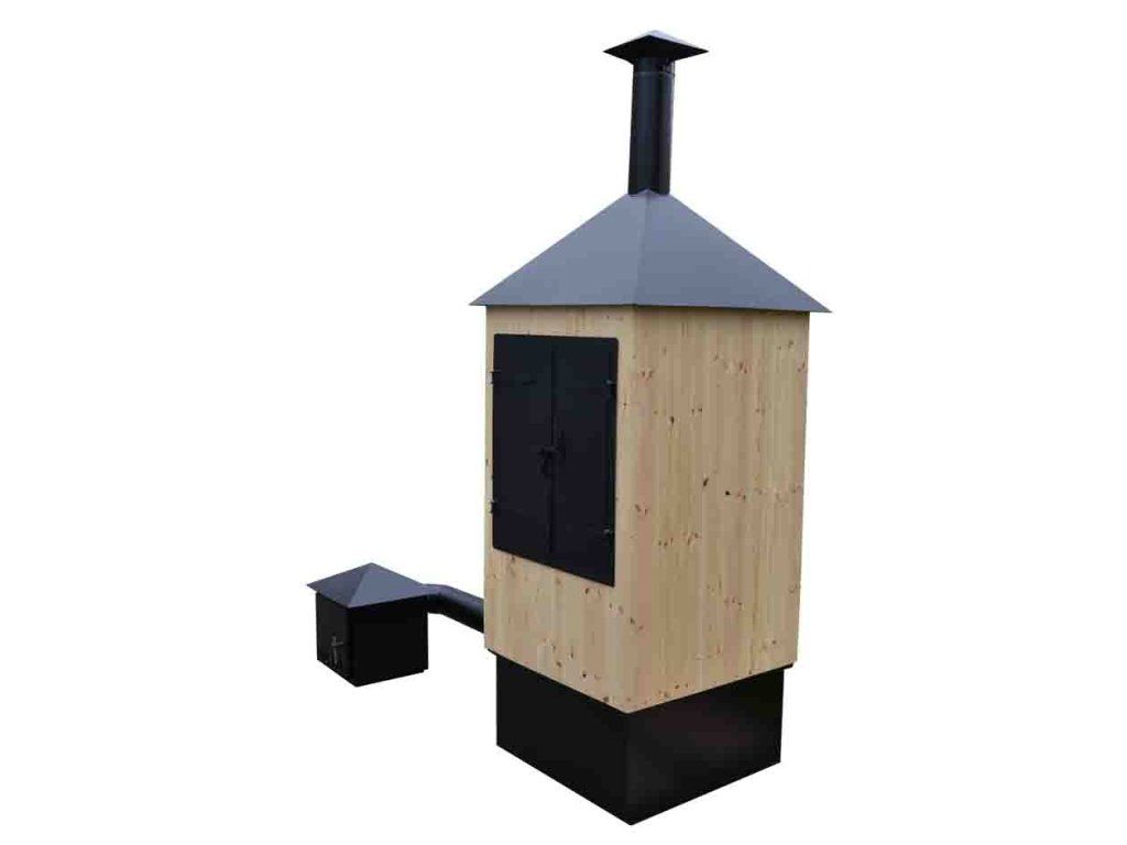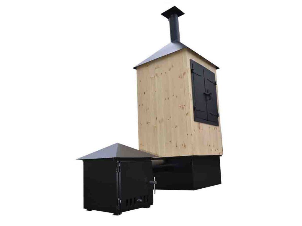 Dřevěná udírna s vlastním topeništěm má objem 0,9 m3. Celoocelová sestava na udírně je nalakovaná komaxitem, který je velmi odolný na jakékoliv povětrnostní podmínky. Udírna má vlastní topeniště, má clonu, která pohlcuje teplo, nedohází tak k velkému odchodu teplého kouře. Černě nalakované topeniště má rošt, popelník a celé je zastřešeno stříškou s přesahem 50 mm na každou stranu. Potrubí je nasměrované do rozrážeče kouře, který zajistí rovnoměrné roznesení kouře po udírně. Na rozrážeči je umístěn popelník, do kterého je nutné nasypat písek aby nedocházelo k odpařování tuku. V udírně je jedno patro na zavěšení potravin s pěti pozicemi a 12 háčků, přes dno je zavěšená síť pro zachycení padajících kousků potravin. Teploměr se nachází nad dvířky