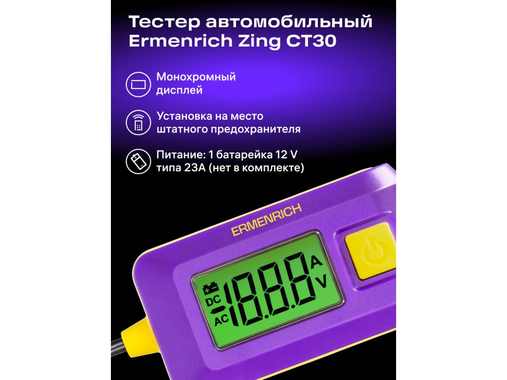 Automobilový tester Ermenrich Zing CT30 funguje na jednu baterii, je vyroben z odolného ABS plastu a má malý vestavěný displej.