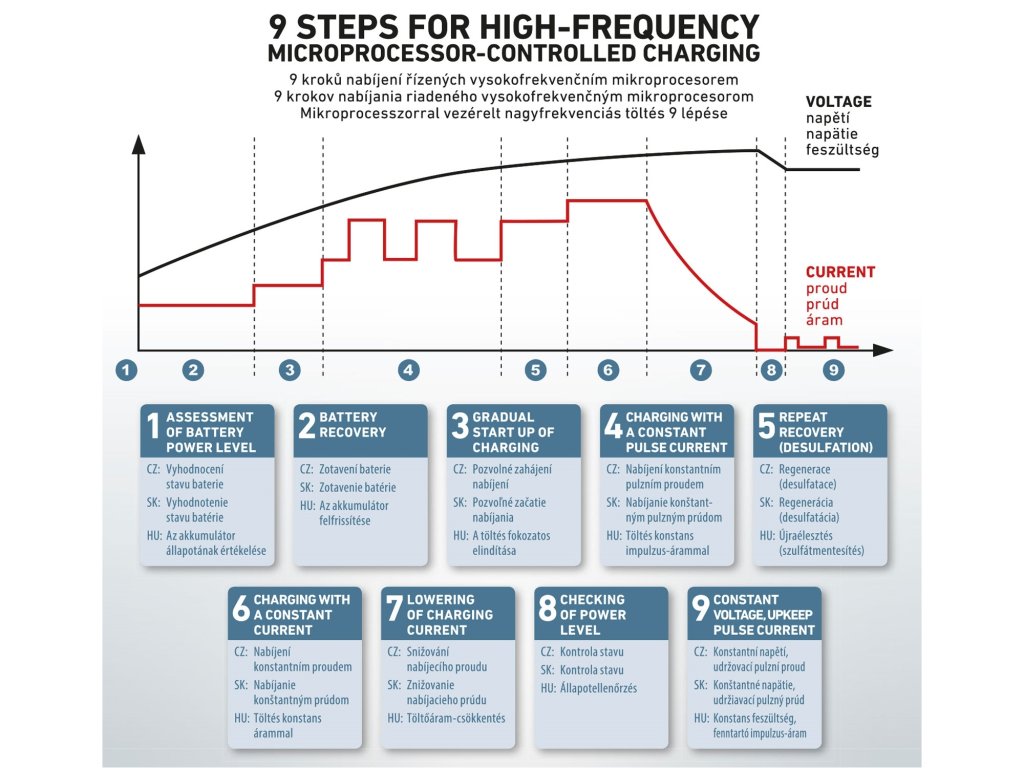 - regeneruje a nabíjí vybité baterie (desulfatace) a umožňuje nabíjet baterie i při nízkých teplotách