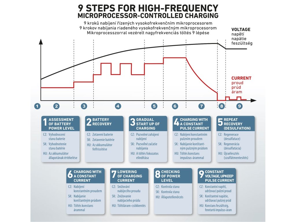 - regeneruje a nabíjí vybité baterie (desulfatace) a umožňuje nabíjet baterie i při nízkých teplotách