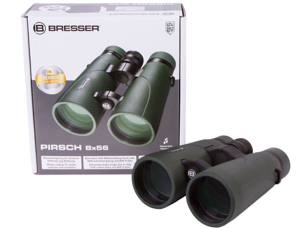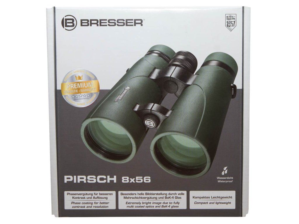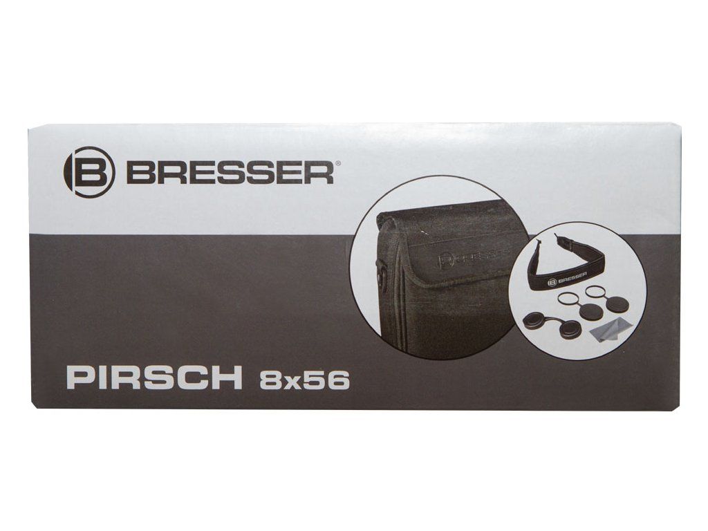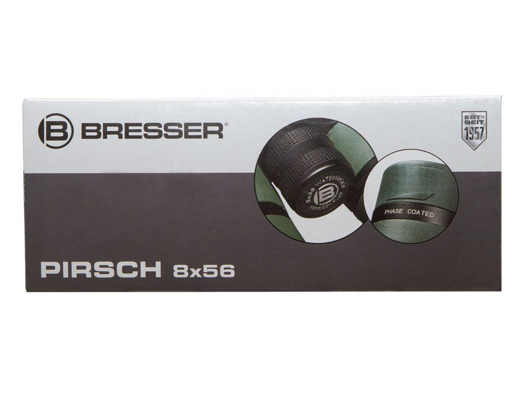 Optika tohoto triedru je kompletně pokryta několikanásobnou antireflexní vrstvou a opatřena nejnovější fázovou povrchovou úpravou, díky čemuž je obraz mimořádně ostrý a silně kontrastní. Vysoce kvalitní optické sklo BaK–4 zajišťuje jasný a čistý obraz pozorovaných objektů. Twist-up očnice usnadňují používání triedru osobám s brýlemi, které si tak mohou vychutnat plné zorné pole. Očnice jsou nastavitelné ve dvou polohách a umožňují i pohled bez brýlí. Pryží pancéřované tělo zajišťuje pevný úchop. Dalekohled je vodotěsný a naplněný dusíkem, aby se zabránilo mlžení optiky. Binokulární dalekohledy Bresser Pirsch 8x56 se dodávají s širokým a velmi pohodlným popruhem na krk.