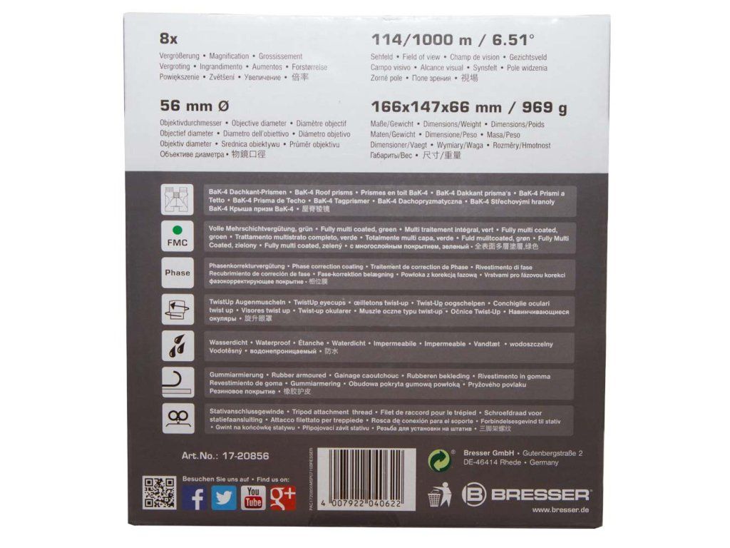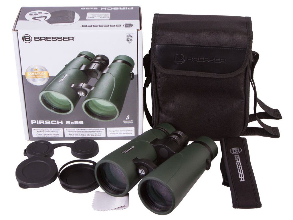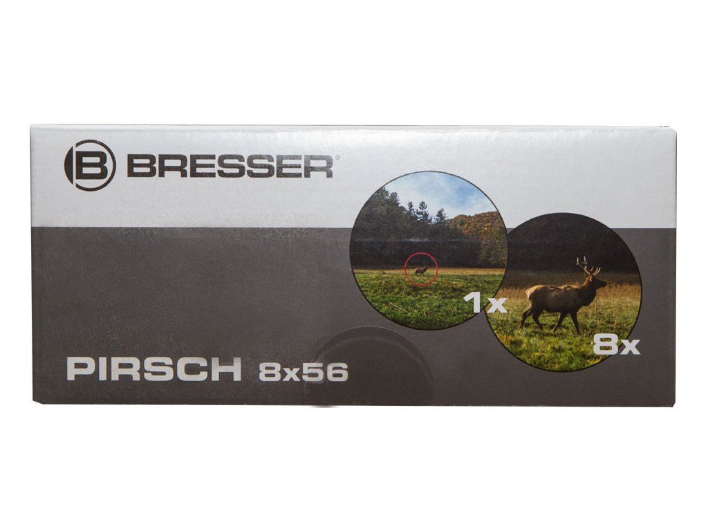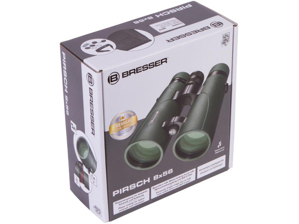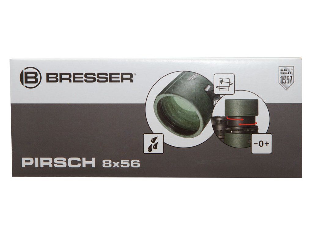 Optika tohoto triedru je kompletně pokryta několikanásobnou antireflexní vrstvou a opatřena nejnovější fázovou povrchovou úpravou, díky čemuž je obraz mimořádně ostrý a silně kontrastní. Vysoce kvalitní optické sklo BaK–4 zajišťuje jasný a čistý obraz pozorovaných objektů. Twist-up očnice usnadňují používání triedru osobám s brýlemi, které si tak mohou vychutnat plné zorné pole. Očnice jsou nastavitelné ve dvou polohách a umožňují i pohled bez brýlí. Pryží pancéřované tělo zajišťuje pevný úchop. Dalekohled je vodotěsný a naplněný dusíkem, aby se zabránilo mlžení optiky. Binokulární dalekohledy Bresser Pirsch 8x56 se dodávají s širokým a velmi pohodlným popruhem na krk.