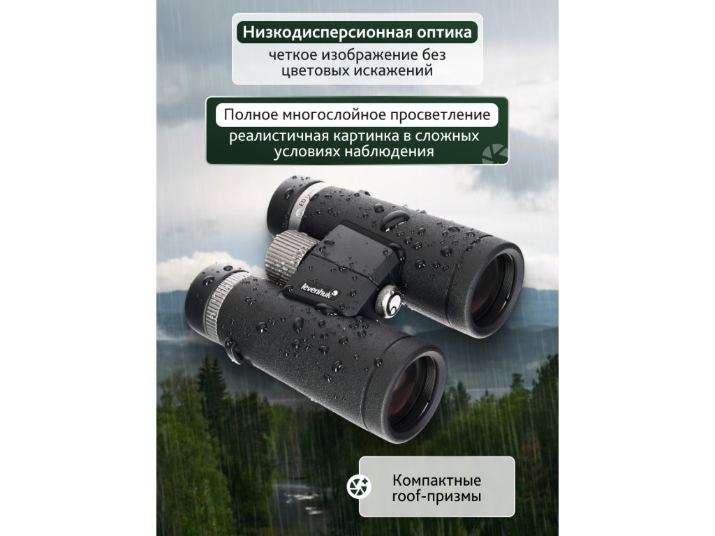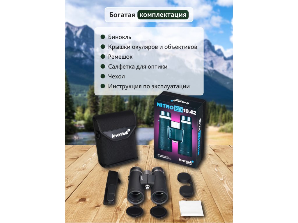 Dalekohled se střechovými hranoly Levenhuk Nitro ED 10x42 10x nabízí všechny výhody skla s velmi nízkým rozptylem ve vodotěsném těle plněném dusíkem. Dalekohledy poskytují mimořádně jasný obraz s ostrými detaily a bohatým barevným podáním a odolávají dešti, sněhu a dokonce i krátkodobému ponoření pod vodu. Na tyto dalekohledy nemají vliv změny teplot – čočky se nezamlžují ani za nepříznivých povětrnostních podmínek. Tento model je skvělou volbou pro jakékoli pozorování v terénu, ať už jde o průzkum okolí nebo sledování cíle při lovu.