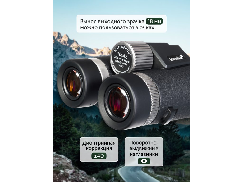 Optika ED vytváří obraz bez zkreslení barev, čímž výrazně zlepšuje jeho kvalitu a rozlišení. Vícenásobná antireflexní vrstva skla zvyšuje propustnost světla, což je důležité zejména při pozorování za soumraku a při zataženém počasí, kdy není dostatek venkovního světla. Dalekohledy Levenhuk Nitro ED 10x42 mají optimální kombinaci zvětšení a zorného pole – na jedné straně vidíte vzdálené objekty a na druhé straně celou krajinu.
