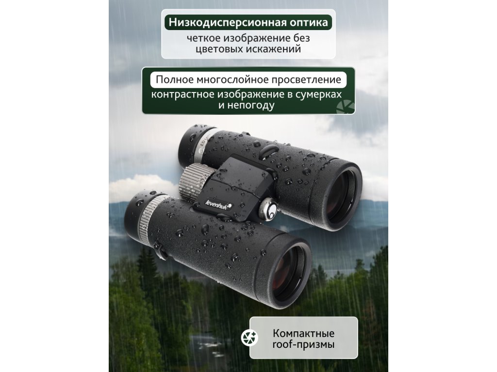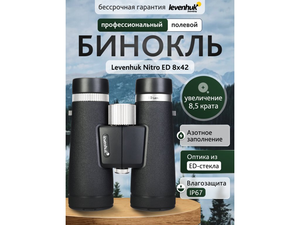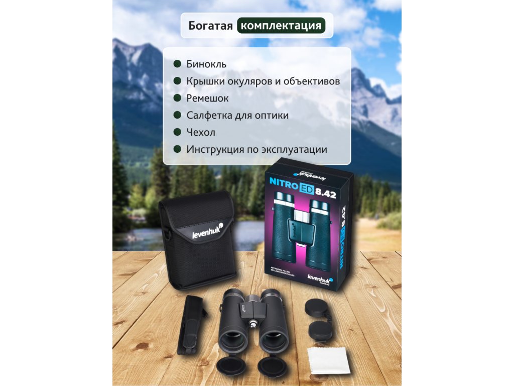 Dalekohled Levenhuk Nitro ED 8x42 s optikou s velmi nízkým rozptylem poskytuje ostrý, jasný obraz s vysokým rozlišením bez zkreslení barev. I ty nejmenší detaily jsou zřetelně vidět z dálky a vícenásobná antireflexní vrstva poskytuje jasný obraz i při zatažené obloze a za soumraku. Tyto dalekohledy jsou voděodolné a plněné dusíkem a jsou nejvhodnější pro pozorování v terénu – sledování zvěře na lovu, pozorování území ze strážní věže, hledání orientačních bodů při pěší turistice a rybaření.