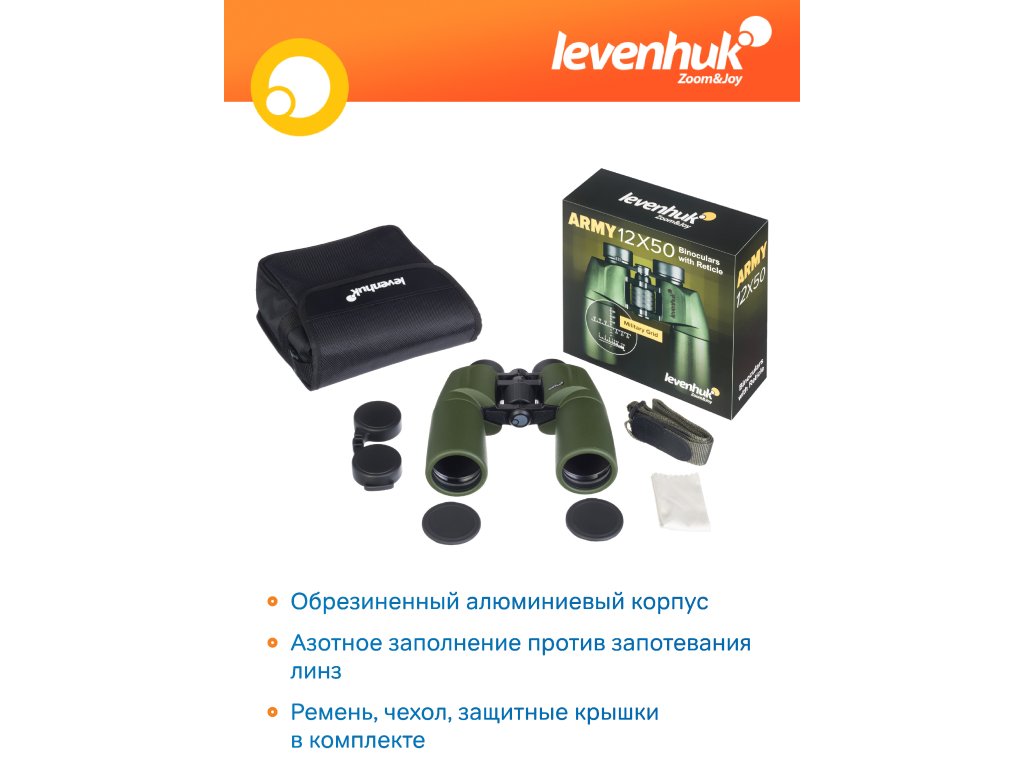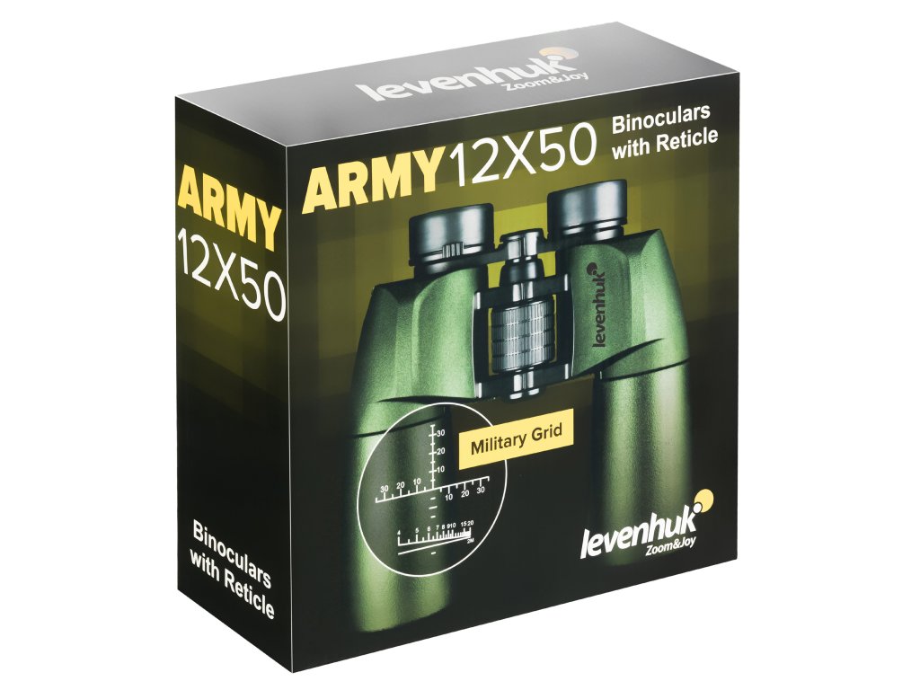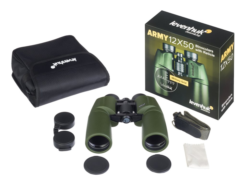 Seznamte se s dalekohledem Levenhuk Army 12x50 – nejpokročilejším modelem této produktové řady. Tento dalekohled dosahuje až 12x zvětšení obrazu a díky čočkám s velkou světelností nabízí ostrý a jasný obraz i za šera. Tento model je skvělou volbou pro profesionální pozorování či venkovní měření. Skvěle se hodí na lov, pátrací akce nebo průzkumy terénu, ale také na sport a střelbu. Měřítka v okuláru vám pomohou určit vzdálenost a vypočítat výšku cílů a úhly (výškový a horizontální úhel).