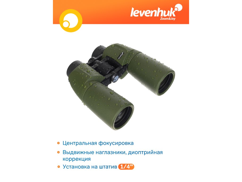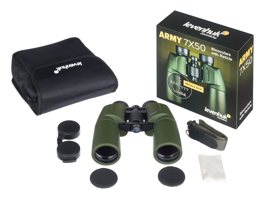 Binokulární dalekohled se zaměřovačem Levenhuk Army 7x50 je optický přístroj s vysokou světelností, jehož funkčnost ocení lovci, turisté, rybáři i vodáci. Je také vynikající pro profesionální použití, např. v geodezii či při ochraně území. S těmito binokulárními dalekohledy můžete pozorovat krajinu a vzdálené cíle při 7x zvětšení nebo provádět různá měření. Měřítka v okuláru dalekohledu umožňují stanovit výšku objektu, vzdálenost k němu, horizontální úhel a výškový úhel.