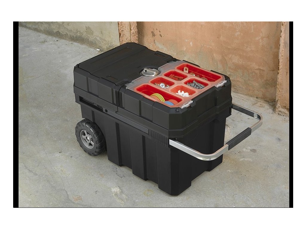 Kovová rukojeť s měkčenou částí pro dlaň a gumová kolečka dotvářejí souhru všech materiálů. Součástí je i systém centrálního zamykání, který chrání obsah za všech okolností. Do posuvné části uložíte 6 odnímatelných červených přihrádek.