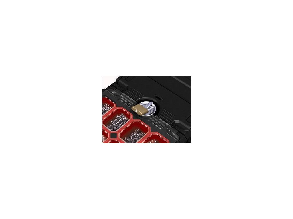 Posuvný systém udržuje všechny dílky v perfektním pořádku. Zároveň však nezvětšuje rozměry organizéru, který zůstává kompaktní a přehledný. Horní část se díky kuličkovému ložisku snadno otevře posunutím do stran. Odkryje tak středový prostor ideální pro nářadí.