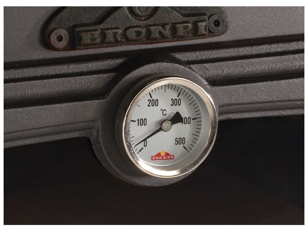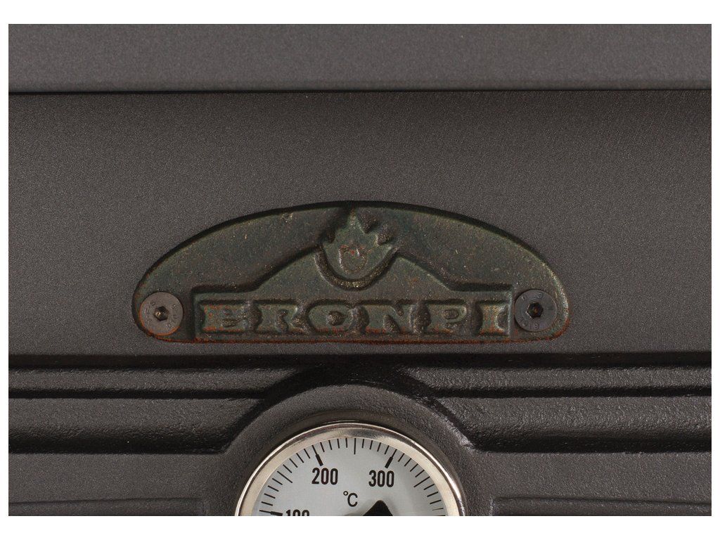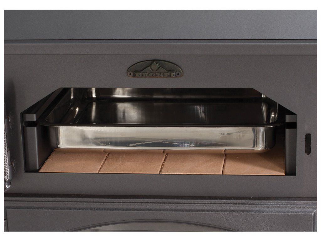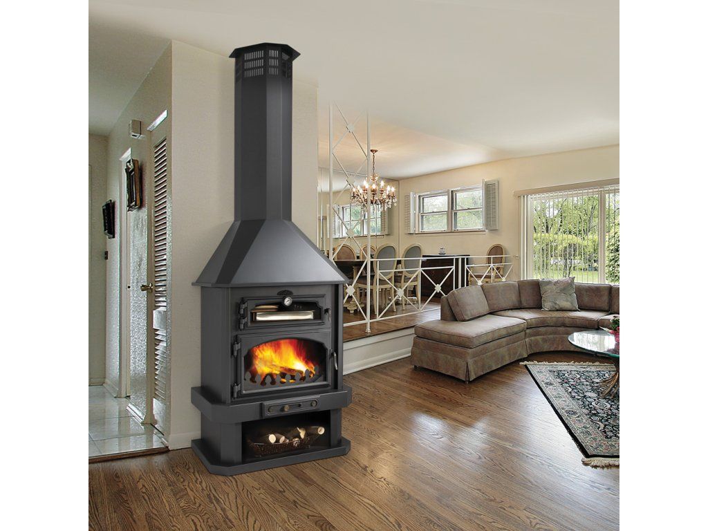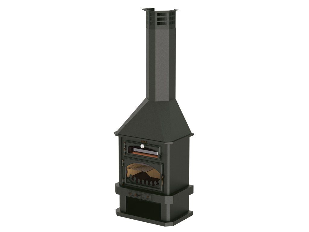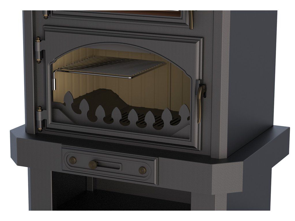 Mohutná krbová kamna - krbové ohniště s troubou v horní části, velké topeniště na dlouhá polena dřeva. Jedná se o krbové ohniště pro přímé horní napojení do komína.