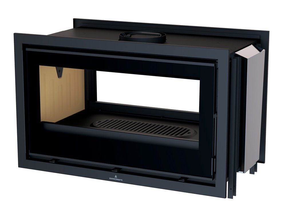 Široká krbová vložka na velká polena vyrobena ve Španělsku od výrobce Bronpi. Je vyrobena z oceli, litiny a vermikulitové výplně ve spalovací komoře.