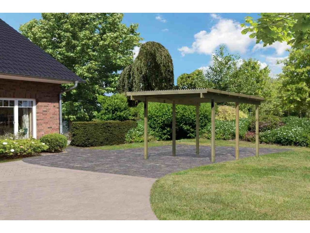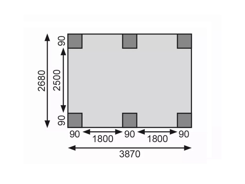 Přístřešek na auto - obdélníkový tvar a svými rozměry vyhovuje řadě modelů vozidel běžných na českém trhu (nutno ověřit velikost vozu). Celková zastřešená plocha je 3,04 x 4,90 m. Průjezdná výška je 206 cm. Střechu podpírá šest dřevěných sloupků 9 x 9 cm. Konstrukce přístřešku je tlakově impregnována a je tak dobře chráněna proti dřevokazným houbám i hmyzu, ale i proti nepříznivým povětrnostním podmínkám. Impregnace je zdravotně nezávadná a naprosto bezpečná. Vzhledem k velkým plochám střechy a zatížení větrem je nutné připevnit přístřešek k zemi pomocí odpovídajících zemních kotev (nejsou obsahem dodávky - lze dokoupit jako příplatkové příslušenství).