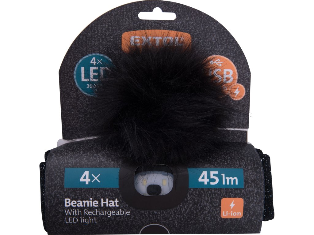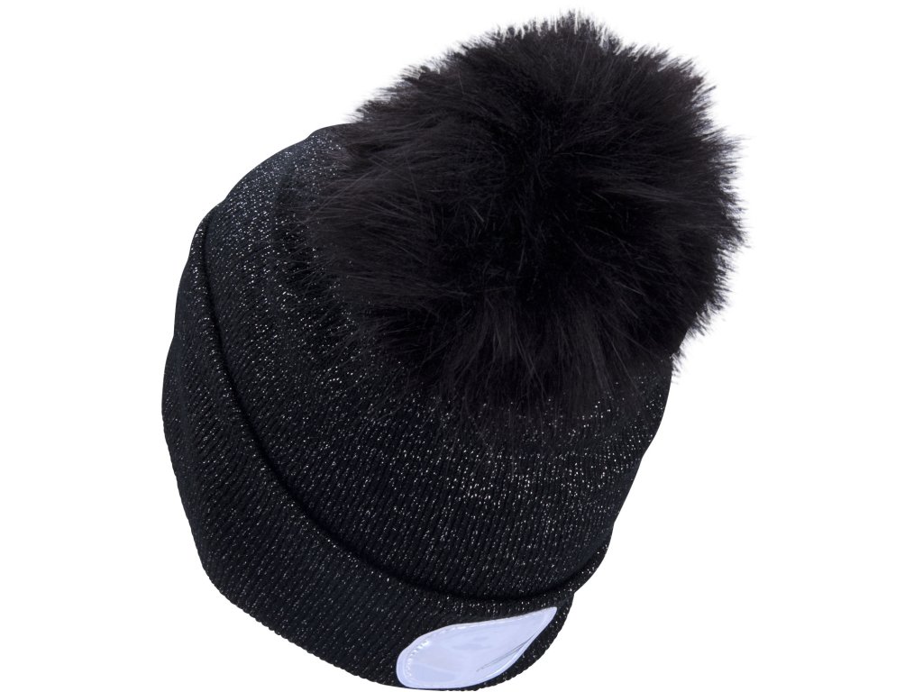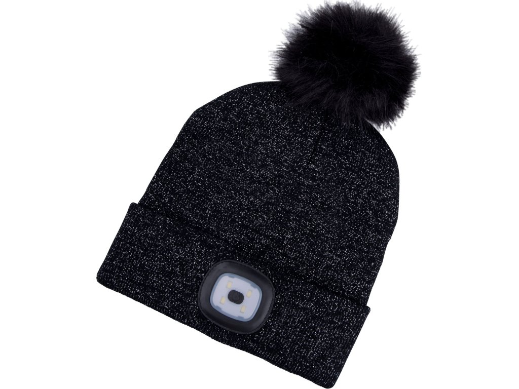 čepice s čelovkou 4x45lm, USB nabíjení, černá se třpytkou a bambulí, univerzální velikost, 90% acryl a 10% polyester