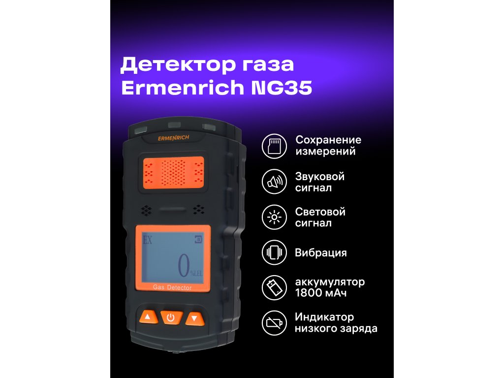 Detektor plynu Ermenrich NG35 je kompaktní, přenosné zařízení, které umožňuje rychle detekovat přítomnost hořlavých plynů: zemního plynu, metanu, etanu, propanu, a butanu. Citlivý snímač detekuje koncentrace plynu v rozsahu 0 % až 100 % LEL; prahovou hodnotu alarmu lze nastavit nezávisle. Rychlost odezvy je kratší než 30 sekund, což umožňuje rychle odhalit úniky plynu a zajistit bezpečnost na pracovišti nebo doma.