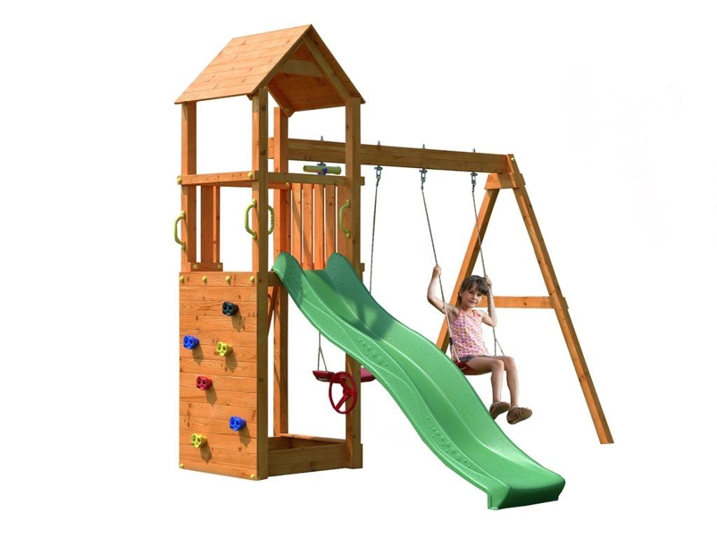 Dětské hřiště MARIMEX PLAY 006 zajistí, že budete mít své ratolesti neustále na očích a nebudete muset opustit vaši zahradu. Zatímco budete pečovat o květiny a záhonky nebo odpočívat po vyčerpávajícím dni v práci, děti si vyhrají na prolézačce s dřevěnou herní věží a dvoumetrové skluzavce. Hřiště podporuje pohyb, protože se na věž leze po žebříku nebo přes horolezeckou stěnu s 6 kameny. Odměnou bude dětem parádní sklouznutí po skluzavce a doplňky na hraní, které věž zdobí. V tomto případě jde o dalekohled a volant. Vaši potomci si mohou hrát na piráty nebo třeba hradní stráž. Zkrátka na vše, co jim fantazie dovolí. Když je hra omrzí, zhoupnou se na houpačce připojené k věži.