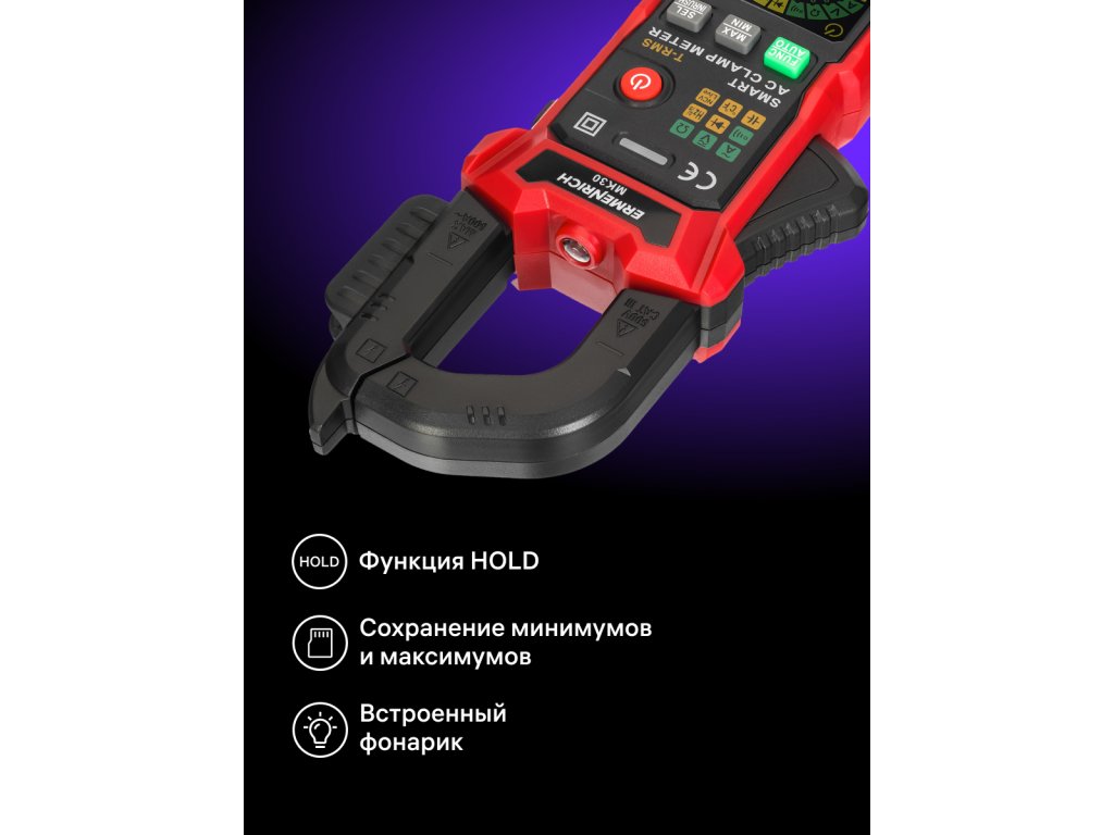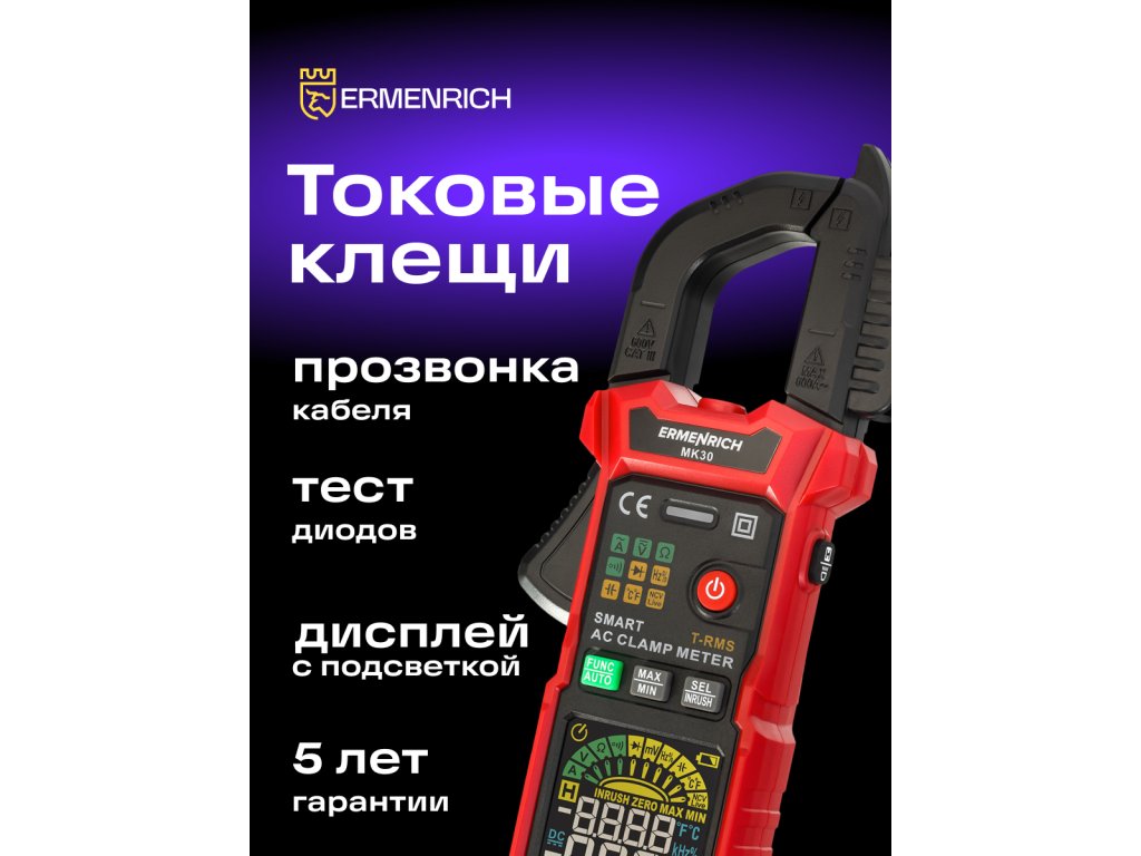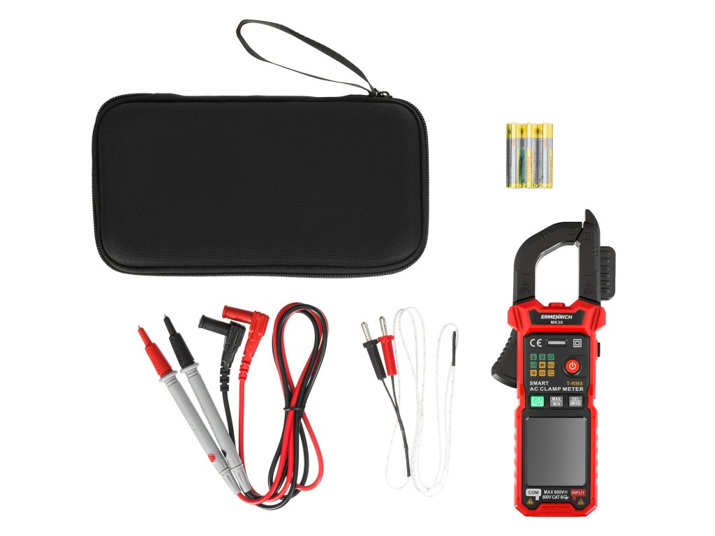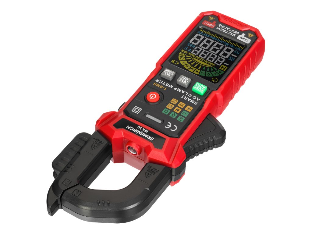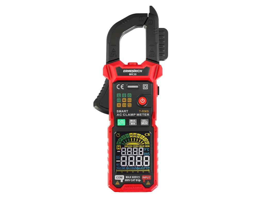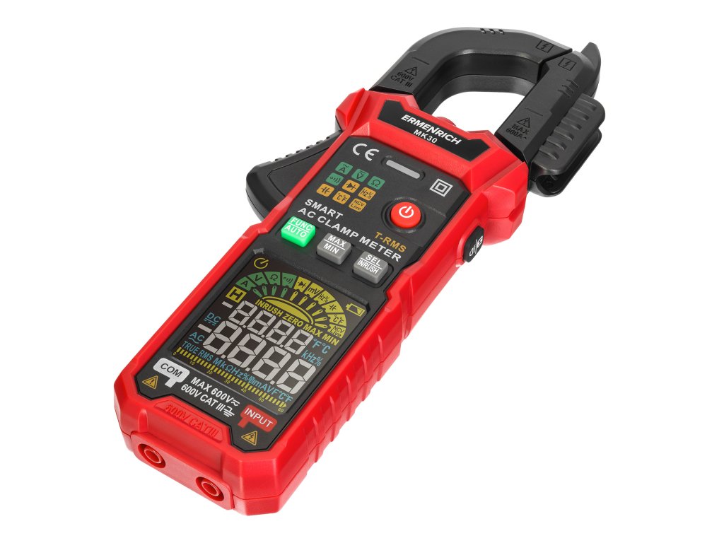Digitální klešťový měřič Ermenrich Ping MK30 kombinuje 7 měřicích funkcí a umožňuje komplexní diagnostiku elektrických sítí a elektrických zařízení. Přístroj samostatně volí mezní hodnoty měření pro každý provozní režim a zobrazuje naměřené hodnoty na vestavěném displeji ve formě čísel a hodnot na grafické stupnici. Přítomnost funkce Smart výrazně zjednodušuje používání přístroje: Přístroj měří napětí, odpor a kontinuitu obvodu v plně automatickém režimu.Malé rozměry umožňují používat přístroj na těžko přístupných místech, kontrastně podsvícený displej je dobře viditelný i ve tmě a funkce přidržení zobrazení naměřené hodnoty umožňuje „zmrazit“ naměřené hodnoty na displeji, dokud je nebude možné pohodlně přečíst. Přístroj používá metodu True RMS, při které jsou výpočty proměnných veličin prováděny pomocí skutečné střední kvadratické hodnoty, takže naměřená hodnota bude co nejpřesnější.