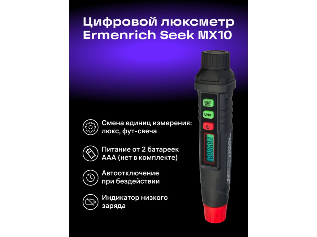 Digitální luxmetr Ermenrich Seek MX10 je vhodný pro měření parametrů osvětlení v nejrůznějších prostorách. Umožňuje monitorovat dodržování pracovních podmínek v kancelářích, vzdělávacích institucích a výrobních zařízeních a také kontrolovat prostory z hlediska dodržování přijatých norem.