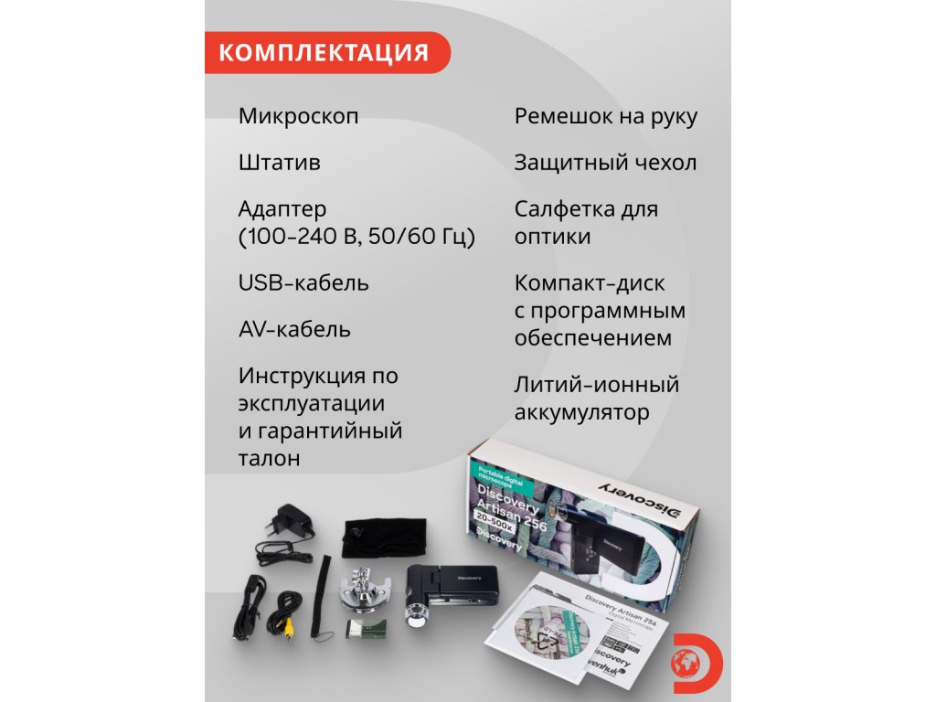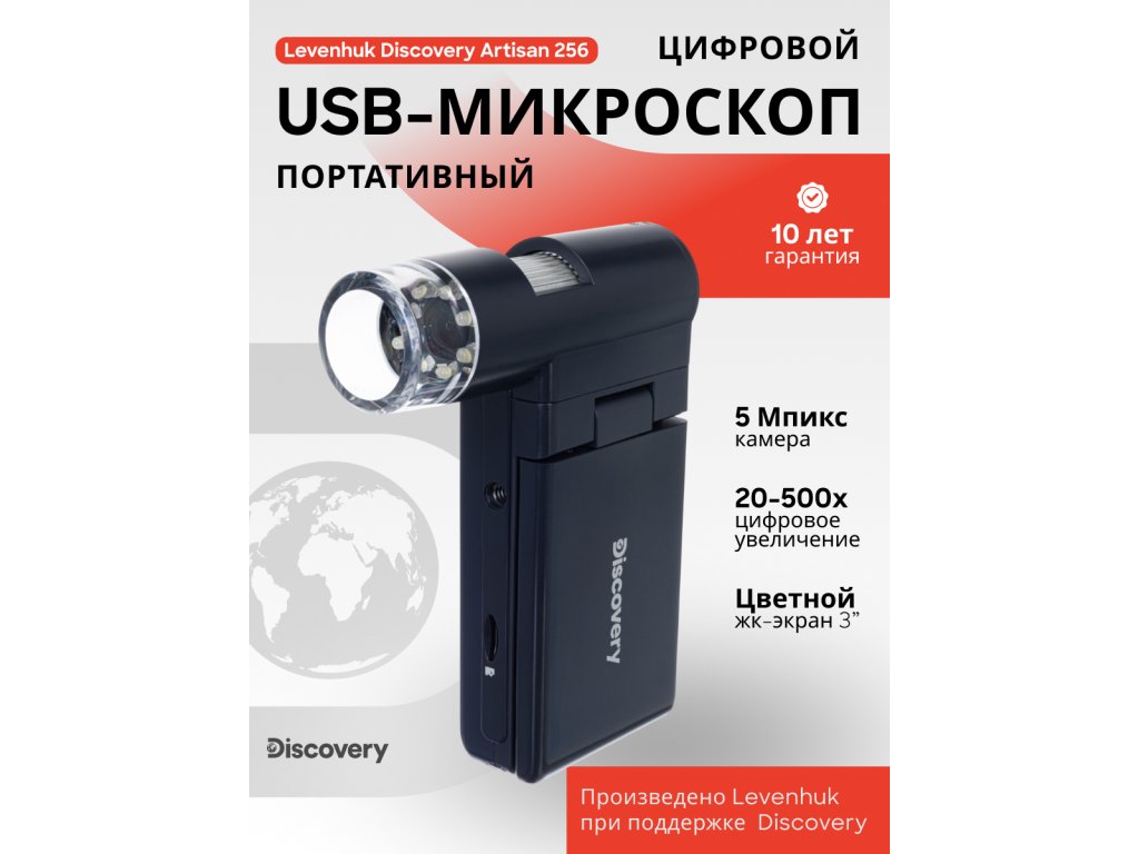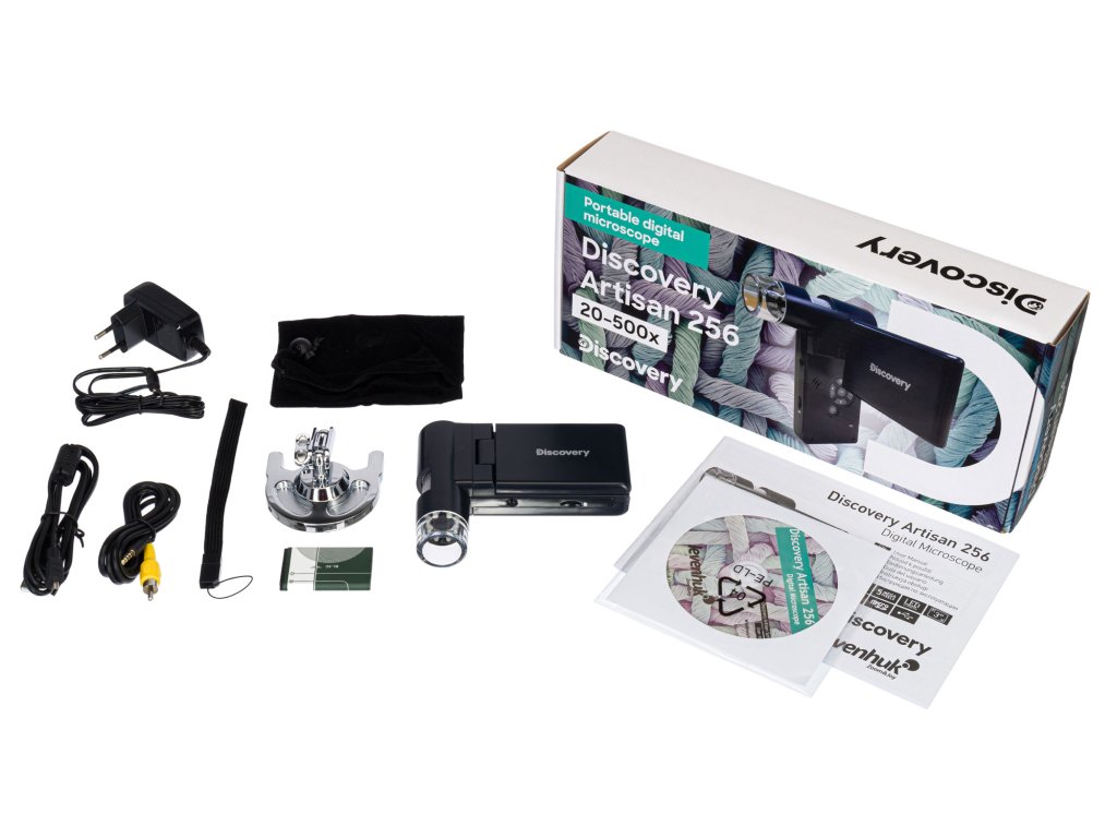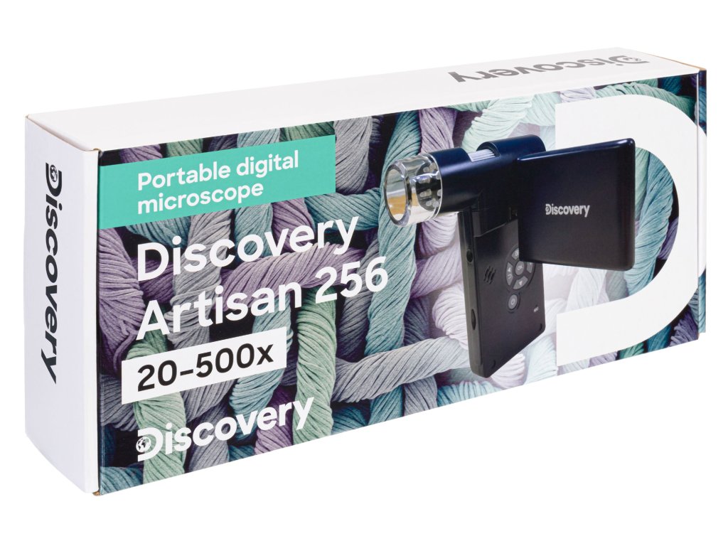Mikroskop Levenhuk Discovery Artisan 256 je přenosný digitální mikroskop s LCD obrazovkou a dobíjecí baterií, který lze použít pro celou řadu profesionálních úkolů. Může být použit pro kontrolu kvality kovů, pájení, opravu elektroniky a hodin. Kromě toho jej lze použít pro hodnocení kvality šperků a uměleckých předmětů, prohlížení struktury kamenů, mincí a další účely. Přenosný mikroskop je často používán ke kontrole kvality zboží v obchodech a detekci růstu nežádoucích životních forem na ovoci a zelenině. Mikroskop je uživatelsky přívětivý. Lze jej připojit k počítači (podporuje operační systémy Windows a Mac OS) nebo k televizoru, umožňuje také pořizovat snímky, nahrávat videa a měřit vzdálenosti, úhly, poloměry a plochy.