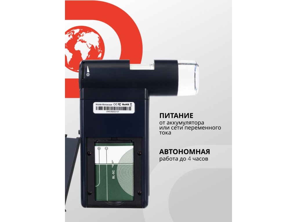 Obraz je tvořen vestavěným 5 Mpx fotoaparátem s interpolací až 12 Mpx. Osvětlení kolem objektivu zahrnuje 8 LED diod s bílým světlem a nastavitelným jasem. Pokud osvětlení nepotřebujete, můžete si jej vypnout. Rozsah zvětšení mikroskopu je od 20x do 500x, zaostření lze upravit v manuálním režimu v rozsahu od 0 do 30 mm.