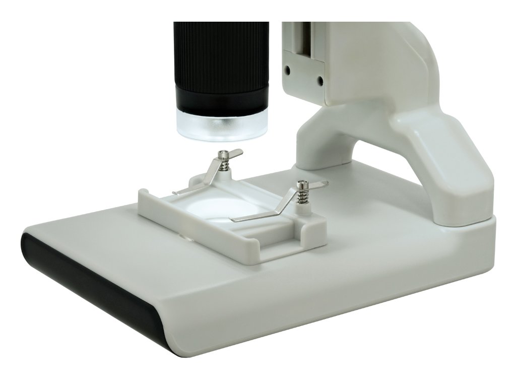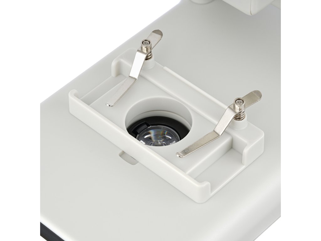 Stolek mikroskopu je osvětlený zespodu i shora. To umožňuje sledování vzorků libovolné průsvitnosti. K upevnění mikroskopických preparátů se používají kovové svorky. Sada obsahuje několik vzorků připravených k pozorování.