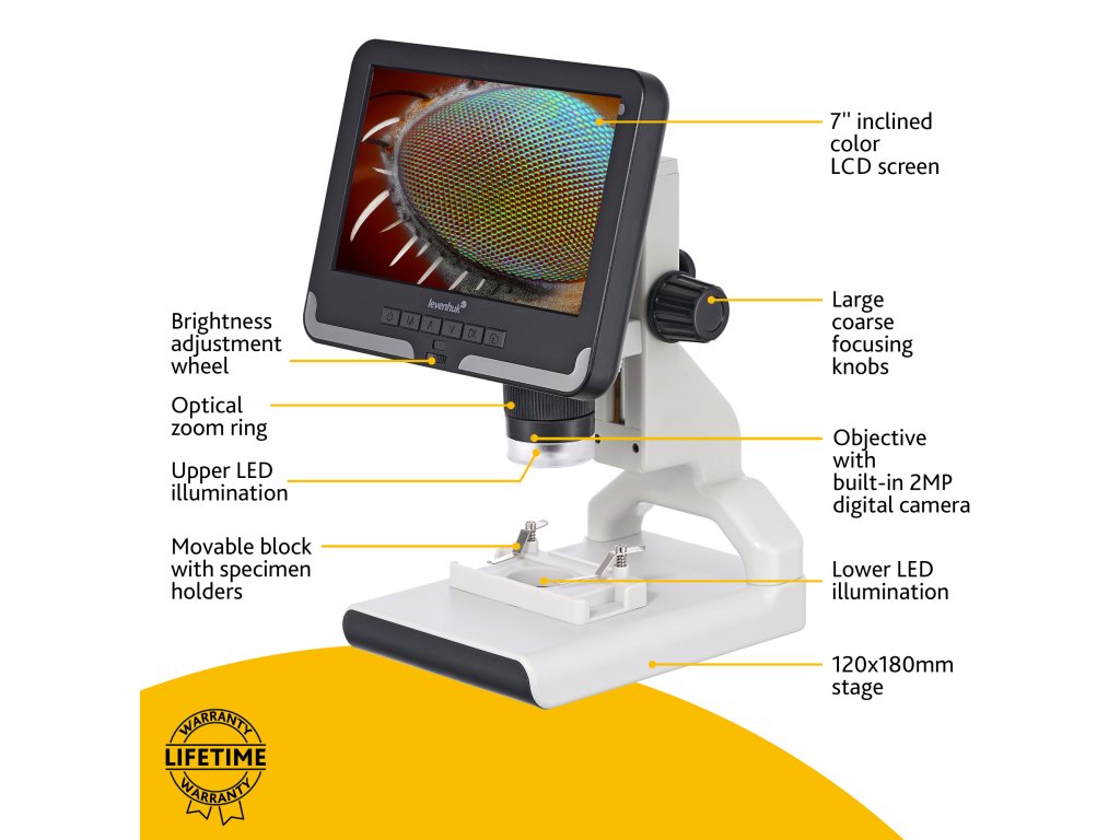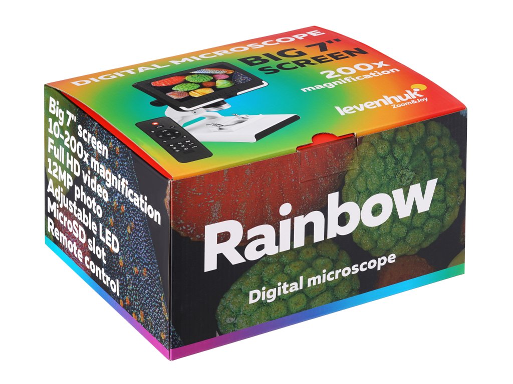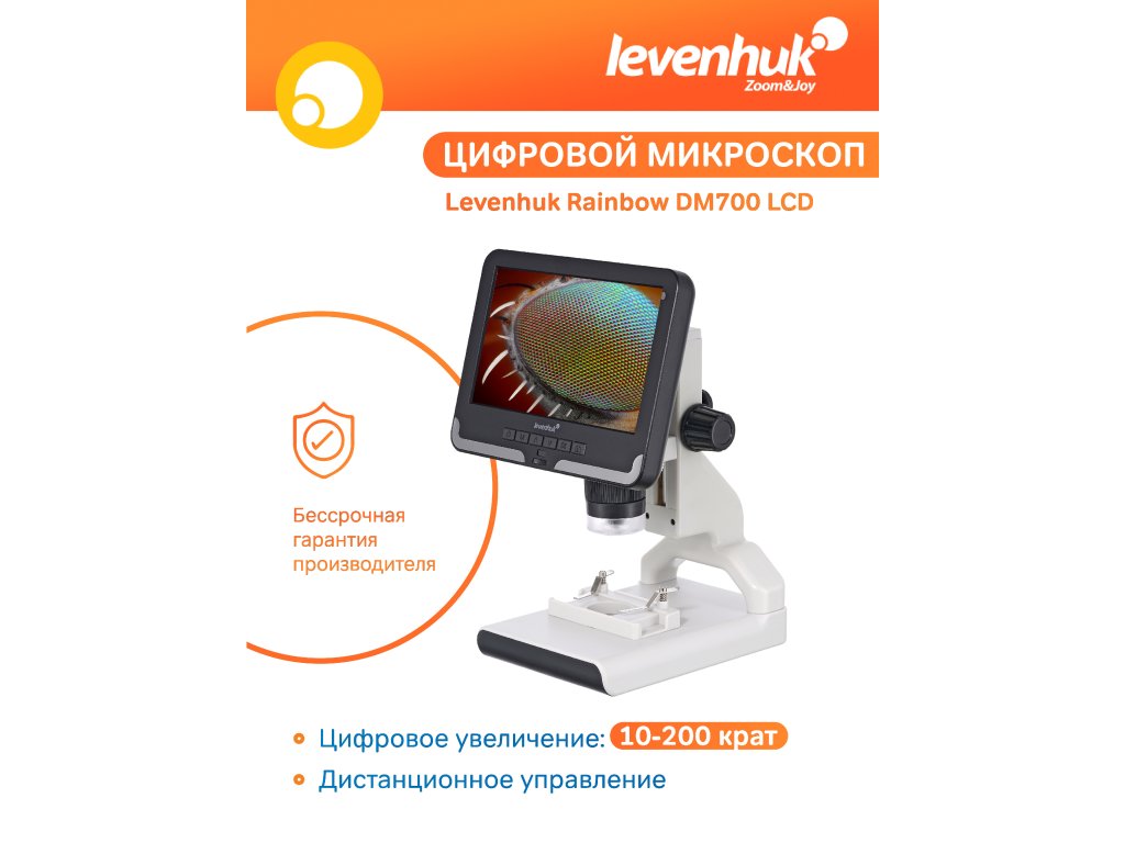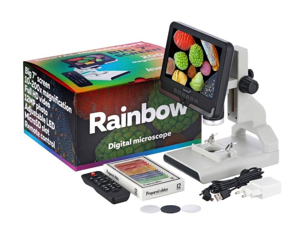 Levenhuk Rainbow DM700 LCD je digitální mikroskop s velkou LCD obrazovkou. Tento mikroskop lze používat pro studování tkanin, hmyzu, mincí a bankovek, vzorků rostlin i strojních zařízení a elektronky. Mikroskop umožňuje záznam videí a pořizování snímků ve vysokém rozlišení a lze ho ovládat pomocí dálkového ovládání.