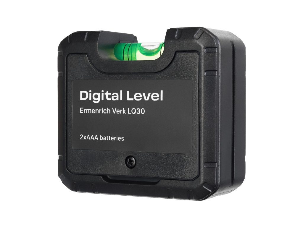 Díky magnetické základně s V-drážkou lze přístroj Ermenrich Verk LQ30 upevnit na jakýkoliv povrch, včetně kovového. Pro pohodlí uživatele je k dispozici funkce přidržení zobrazení naměřené hodnoty a funkce nastavení nuly, které mohou „zmrazit“ naměřené hodnoty a určit relativní úhly. Tělo přístroje je vyrobeno z polykarbonátu a vysoce odolného ABS plastu, díky čemuž je přístroj odolný proti nárazům. Je také voděodolný (chráněn proti dopadajícím kapkám vody). Přístroj je napájen dvěma standardními bateriemi a je vybaven funkcí automatického vypnutí a indikátorem stavu baterií.