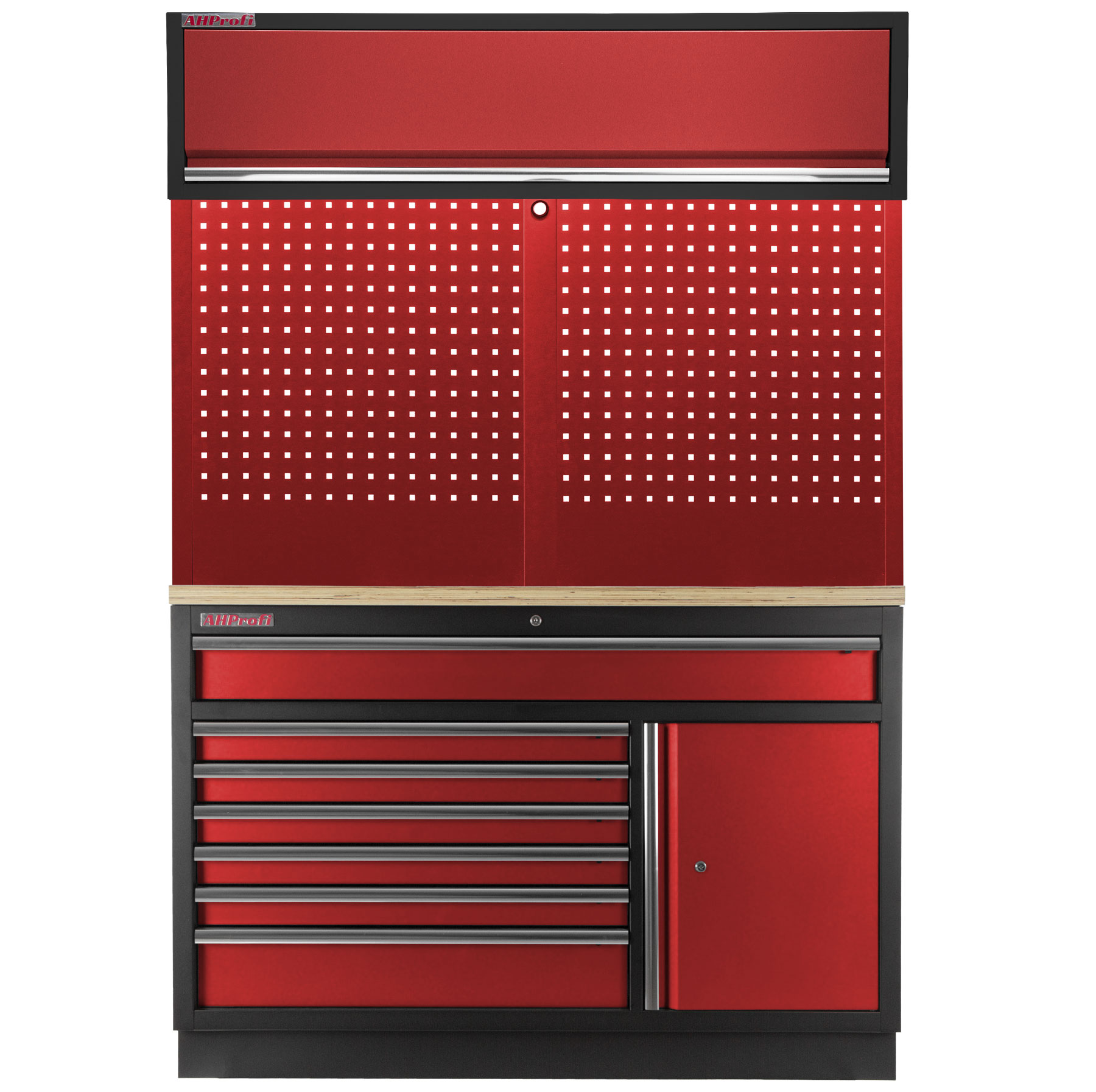 Spodní široká celokovová dílenská skříňka se 7 zásuvkami, skříňkou a dřevěnou pracovní deskou.