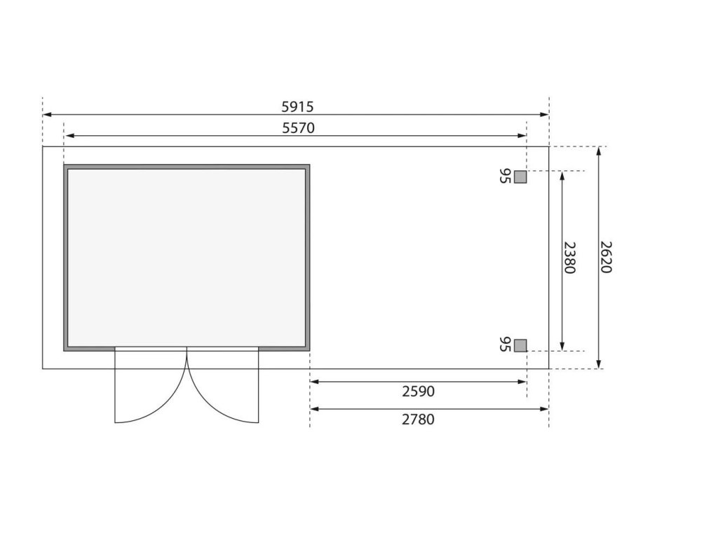 Tato verze domku obsahuje přístavek včetně zadní a boční stěny délky 280 cm montovatelný zprava nebo zleva.