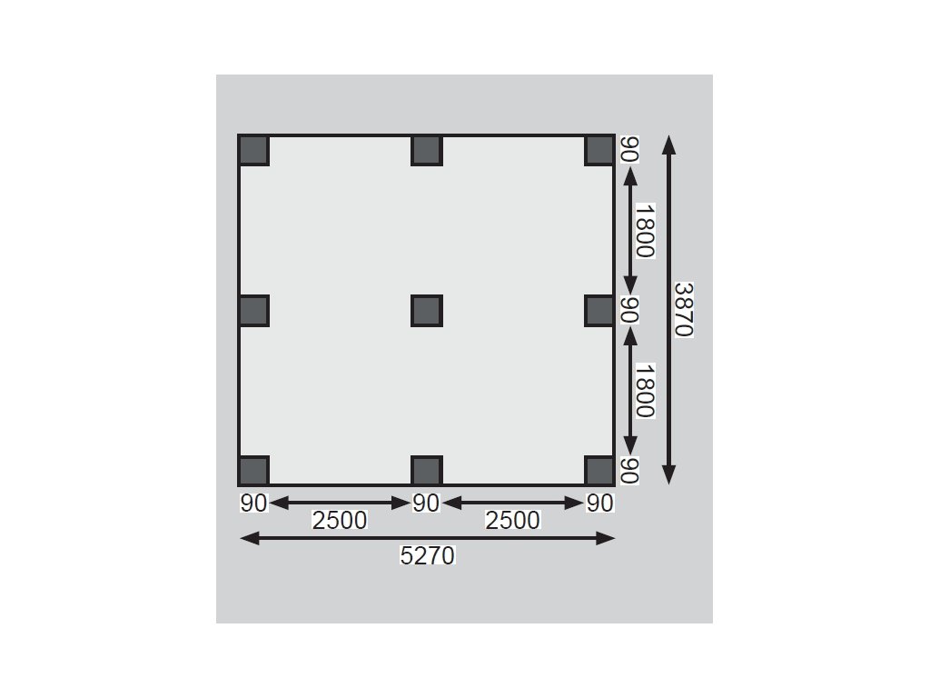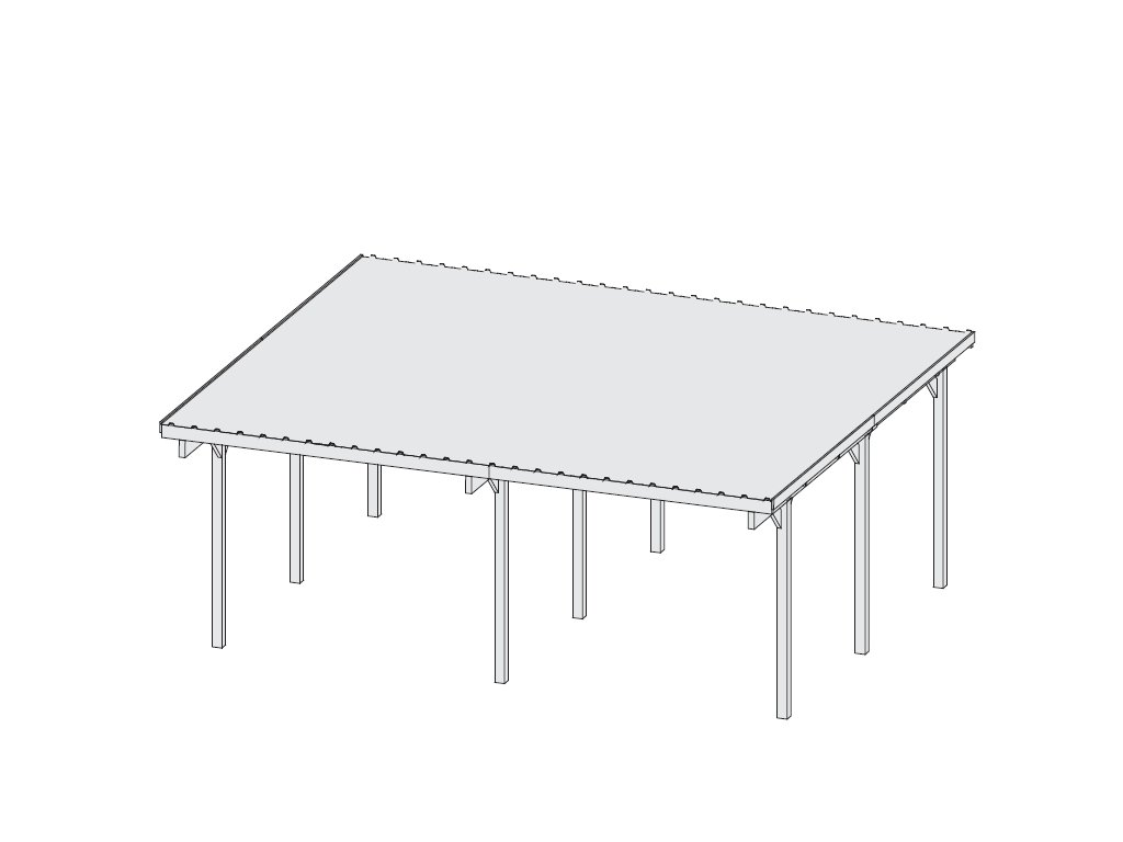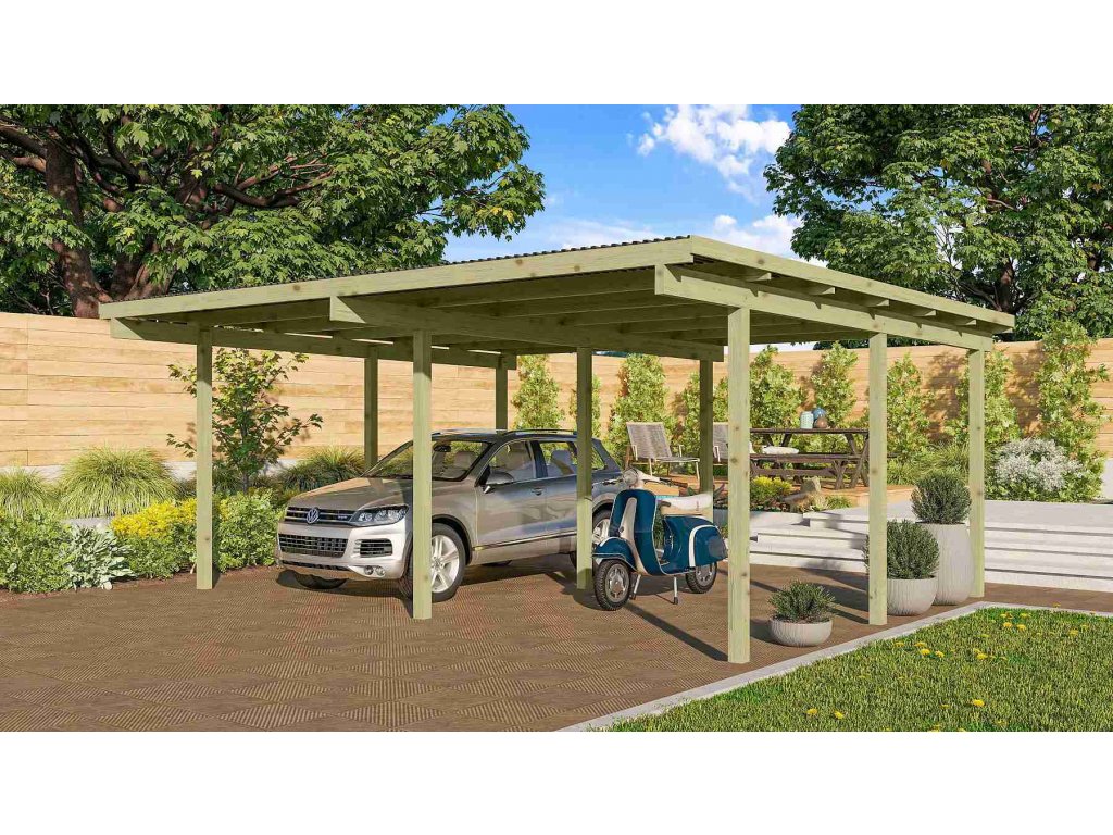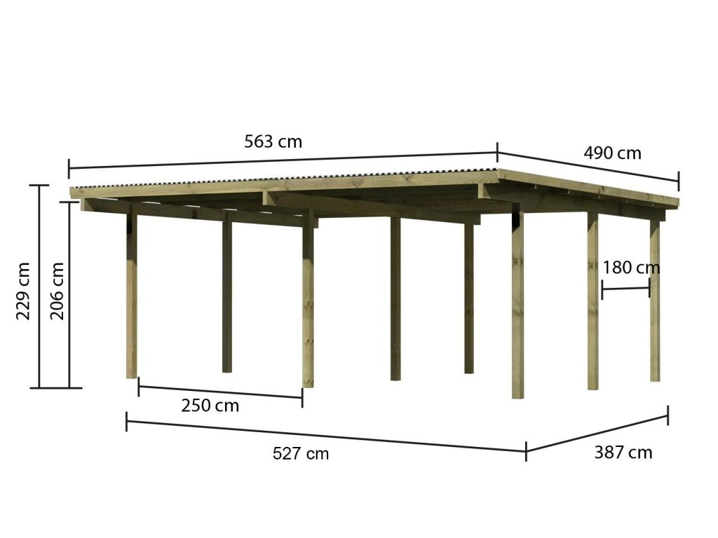 Přístřešek má obdélníkový tvar a svými rozměry vyhovuje většině modelů vozidel běžných na českém trhu. Celková zastřešená plocha je 5,63 x 4,90 m. Průjezdná výška je 206 cm. Střechu podpírá devět dřevěných sloupků 9 x 9 cm. Konstrukce přístřešku je tlakově impregnována a je tak dobře chráněna proti dřevokazným houbám i hmyzu, ale i proti nepříznivým povětrnostním podmínkám. Impregnace je zdravotně nezávadná a naprosto bezpečná. Vzhledem k velkým plochám střechy a zatížení větrem je nutné připevnit přístřešek k zemi pomocí odpovídajících zemních kotev (nejsou obsahem dodávky - lze dokoupit jako příplatkové příslušenství).