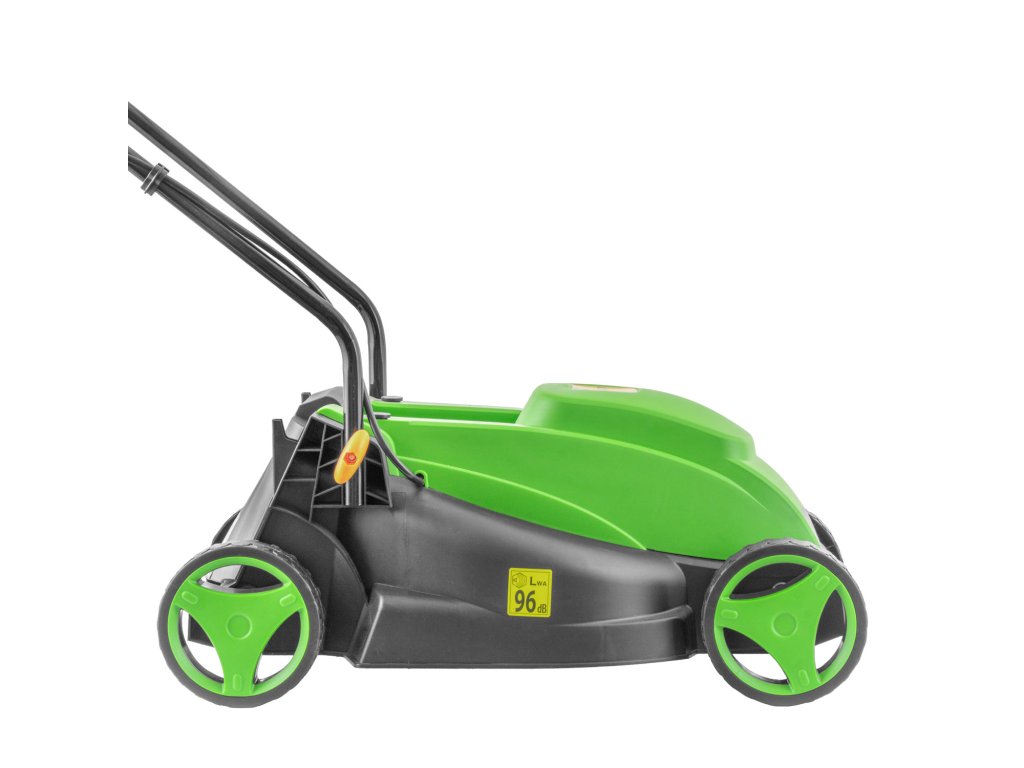 Je vybavena výkonným motorem o síle 1000 W a nabízí 3 úrovně výšky střihu od 25 do 65 mm, což umožňuje přizpůsobení sekačky různým podmínkám trávníku.