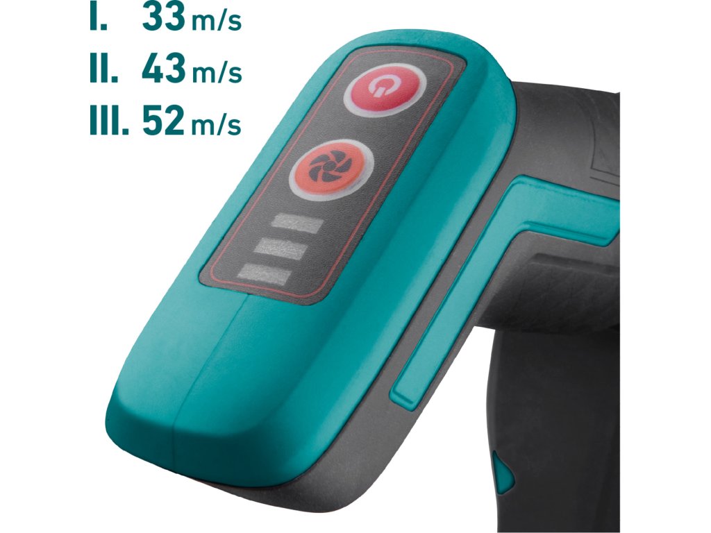 Nízký stupeň slouží pro jemné práce, střední pro běžné čištění a nejvyšší režim s rychlostí vzduchu až 52 m/s efektivně zvládne husté listí i vlhké nečistoty.