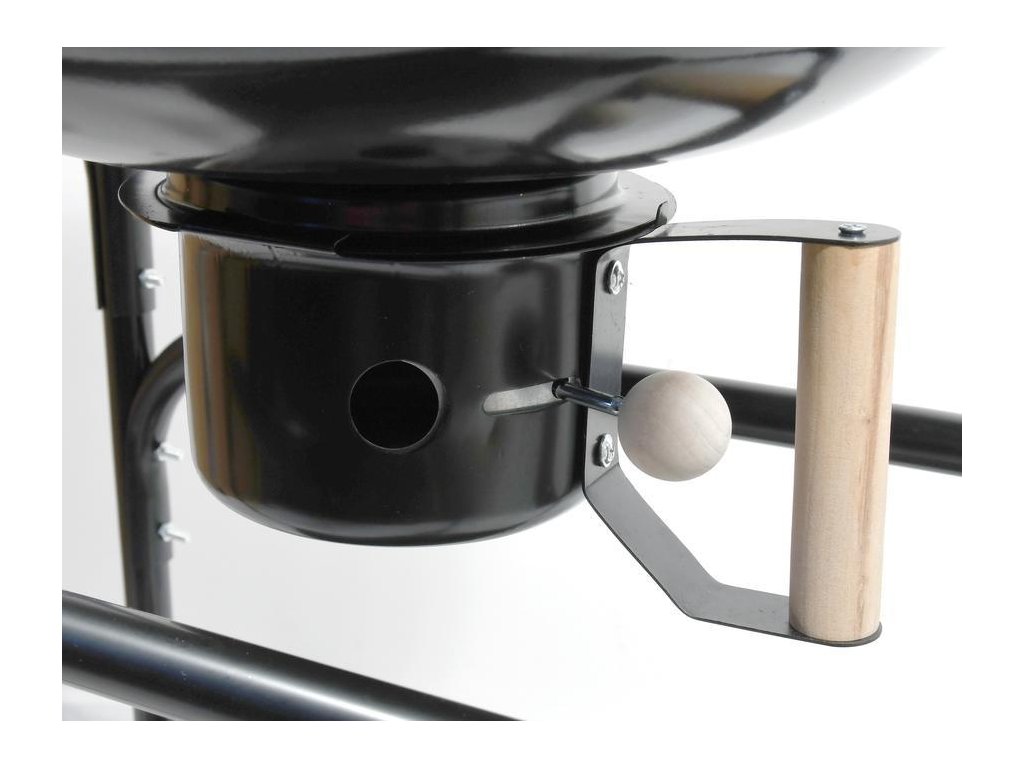 Konstrukce grilu je vyrobena z kvalitního ocelového plechu se smaltovanou povrchovou úpravou, která zajišťuje dlouhou životnost a snadnou údržbu. Chromovaný grilovací rošt poskytuje dostatek prostoru pro tepelnou přípravu masa, zeleniny i dalších pokrmů. Regulovatelná ventilace umožňuje přesnou kontrolu teploty během grilování a vysouvací popelník usnadňuje čištění. Odnímatelné víko je z vnitřní strany opatřeno hákem pro pohodlné zavěšení na bok grilu. Stabilitu zajišťují kovové nohy se zpevňujícím rámem a snadnou manipulaci umožňují plastová kolečka.