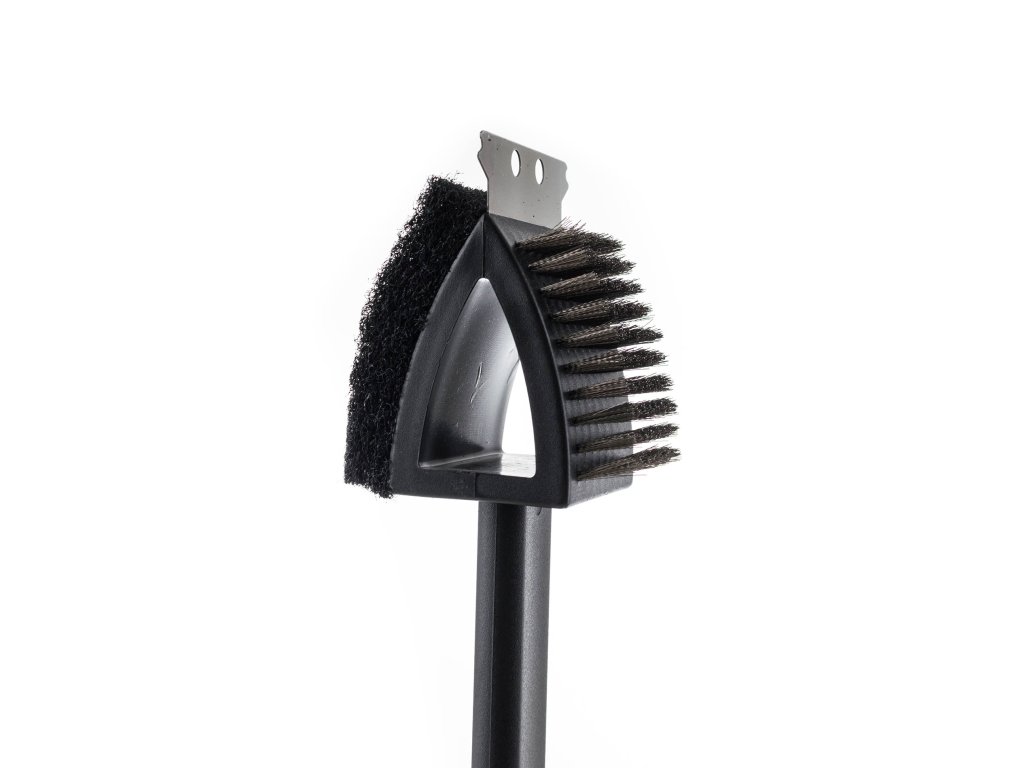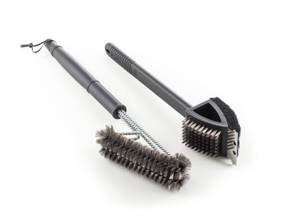 Set se skládá ze dvou kusů náčiní. Na jedné rukojeti je umístěn plochý drátěný kartáč, obdélníková drátěnka a kovová škrabka. Tato část setu je určena převážně pro údržbu grilovacího litinového plátu a kamene. Na druhé rukojeti jsou nasazeny dva oválné drátěné kartáče, které vám pomohou s důkladným vyčištěním grilovacích roštů.