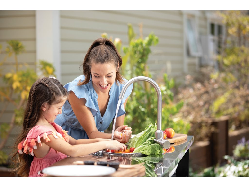 - Integrovaný dřez připojíte k přívodu vody a odpadu a můžete mýt nádobí na zahradě bez složitého přenášení do domácnosti