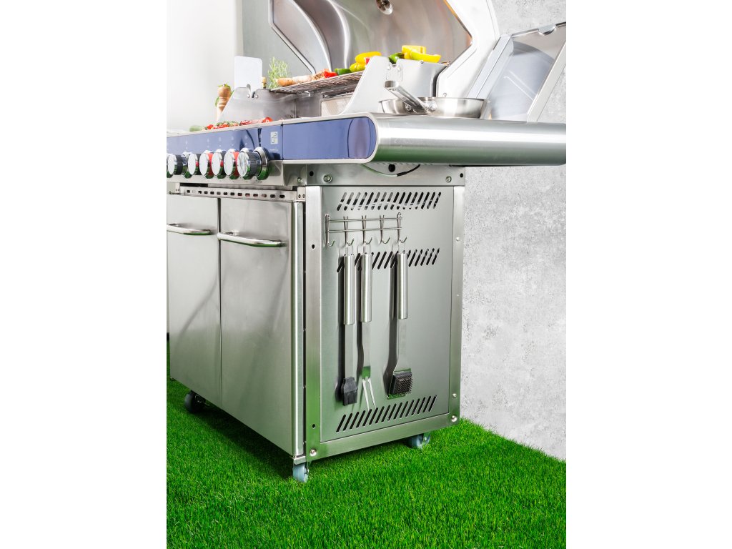5 háčků na liště, kterou jednoduše zavěsíte do připravených otvorů u plynových grilů G21, slouží k zavěšení nejčastěji používaného grilovacího nářadí. Při grilování tak nemusíte hledat grilovací vidlici nebo kleště – stačí po paměti sáhnout na boční stěnu grilu a uchopit právě potřebné nářadí.