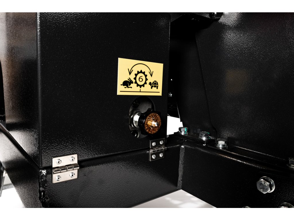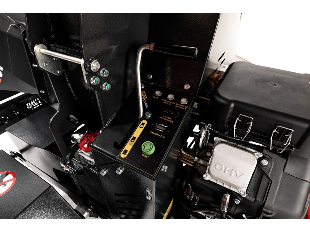 - Drtič využívá automatický hydraulický podavač řízený systémem iFS, který reguluje přísun materiálu podle rychlosti otáčení řezného kotouče. Tento systém chrání motor a zvyšuje celkovou efektivitu a bezpečnost.