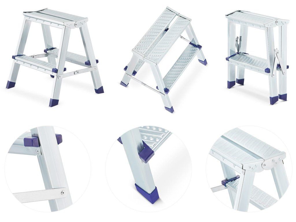 U žebříku s oboustranným vstupem od značky HIGHER® jsme implementovali systém, který umožňuje skládat žebřík do plochého stavu. Díky tomu zabírá žebřík po složení minimální prostor a snadno se vejde téměř kamkoliv - do skříně, do výklenku, prakticky kdekoliv. Takže náš žebřík nezabere mnoho místa a nepřeplní váš interiér. Náš skládací mechanismus je extrémně jednoduchý, odolný a bezproblémový a poskytne vám spolehlivou službu po mnoho let.