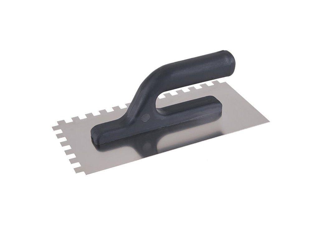 Hladítko nerezové 270x125 mm s plastovou ručkou, zub e10, tl.plechu 0,7 mm. Ostří je perfektně vytvarováno, je vyrobeno z tvrzené nerezové oceli. Používá se zejména k nanášení lepidel pod obklady a dlažby, dále pak k nanášení stěrek, štuků, omítek, tmelů a dalších stavebních hmot.Doplňkové parametry