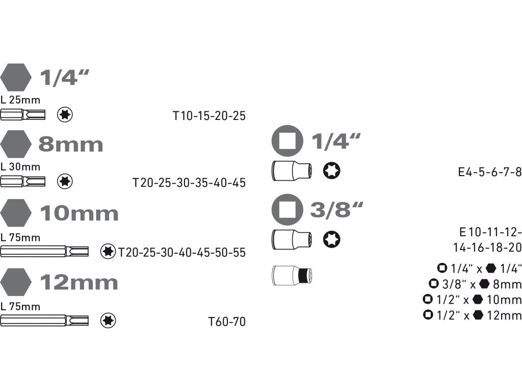 | hroty: | hroty 1/4"x25mm: T10-15-20-25, hroty 8mm(5/16")x30mm: T20-25-30-35-40-45, hroty 10x75mm: T20-25-30-40-45-50-55, hroty 12x75mm: T60-70 |