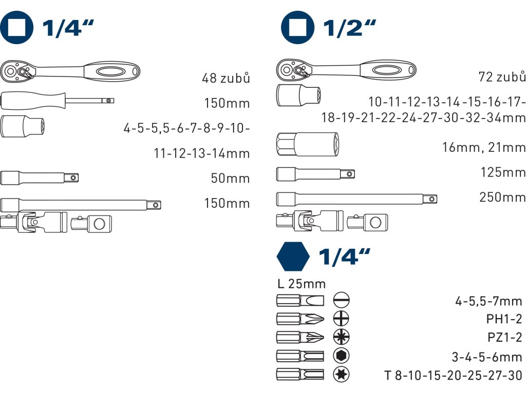 | hlavice nástrčné: | 1/4": 4-5-5,5-6-7-8-9-10-11-12-13-14mm, 1/2": 10-11-12-13-14-15-16-17-18-19-21-22-24-27-30-32-34mm |