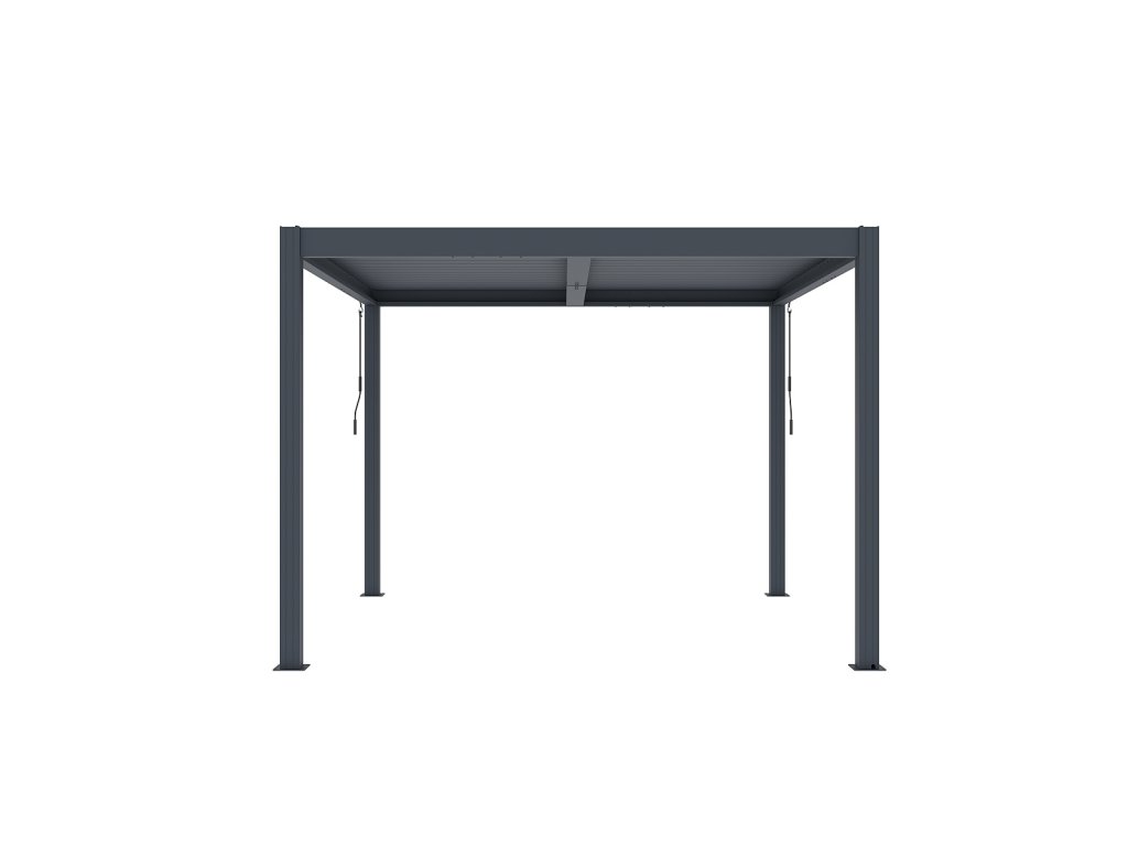 Volně stojící bioklimatická pergola LANITPLAST BASIC o rozměrech 3 x 3 metru je praktickým a elegantním řešením pro zastřešení venkovního posezení na Vaší zahradě. Robustní a stabilní konstrukce v moderním antracitovém odstínu RAL 7016 s matnou povrchovou úpravou se snadno začlení do jakéhokoliv prostředí a nevyžaduje kotvení do stěny. Sloupy i nosné profily jsou vyrobeny z hliníku a otočné lamely z kvalitní oceli, vše je opatřené vypalovaným práškovým lakem (komaxit). Střešní lamely z pozinkované oceli jsou rovněž opatřeny práškovou barvou, která zajišťuje vysokou odolnost vůči povětrnostním podmínkám. Celkem 38 otočných lamel poskytuje spolehlivou ochranu před slunečními paprsky i deštěm. Jejich sklon lze plynule nastavit od zcela uzavřené polohy (0°) až po plné otevření v úhlu 90°. Ovládání lamel je manuální a probíhá pomocí praktické kličky, která je konstruována tak, aby bylo možné ji naklonit a zabránit tak poškození povrchu pergoly při manipulaci. Její umístění navíc umožňuje bezproblémové používání dalších doplňků, jako jsou boční zástěny nebo moskytiéry, aniž by omezovala jejich funkčnost.