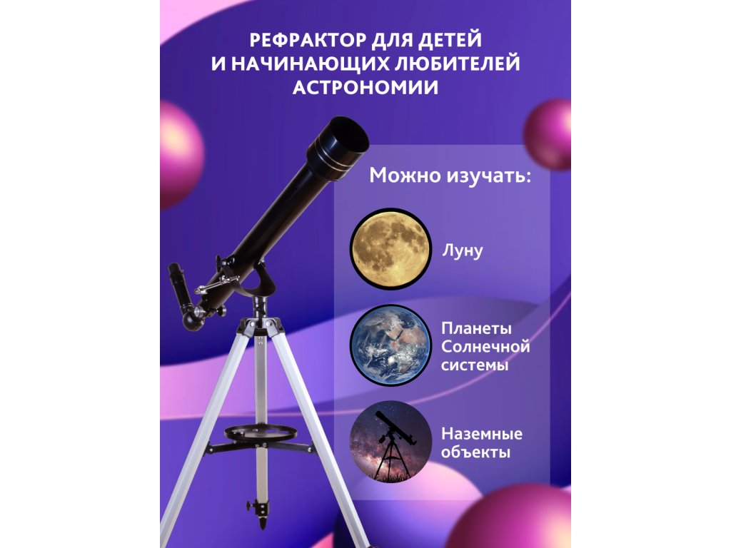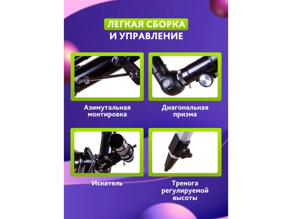 Všechny čočky v teleskopu jsou vyrobeny z optického skla a jsou chráněny antireflexním povrchem. Optika zajišťuje kontrastní, ostrý a čistý obraz. Měsíc je při maximálním zvětšení nádherný: dokonce můžete pozorovat jeho krátery o průměru větším než 8 km. Optický hledáček s 5násobným zvětšením umožňuje rychlé zaměření astronomických objektů. Pro přesné zaměřování se používá klasická alt-azimutální montáž. Tato montáž umožňuje snadný pohyb optické trubice podél os. Tento teleskop může ovládat dokonce i dítě.
