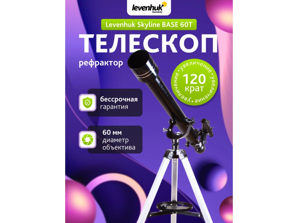 Teleskop Levenhuk Skyline BASE 60T představuje refraktor pro děti a začínající astronomické amatéry. Sada obsahuje příslušenství, které umožňuje detailní studium Měsíce a pozemských objektů. Můžete pozorovat planety Sluneční soustavy; některé galaxie budou také viditelné. Tento teleskop je snadno ovladatelný; jeho údržba je velmi jednoduchá; teleskop obsahuje velmi kvalitní optiku. Je ideální pro první astronomická pozorování. Levenhuk Skyline BASE 60T je dobře vyvážený teleskop pro studium vesmíru.