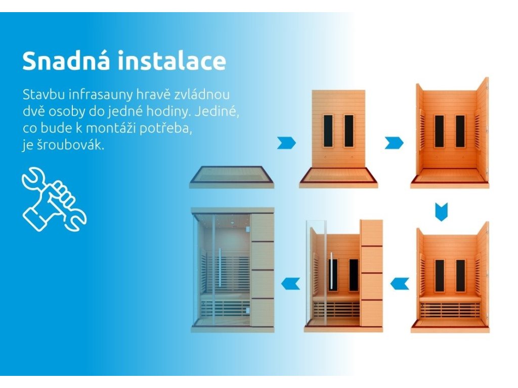 Vyberte si ideální místo v interiéru, kam chcete infrasaunu umístit. Teplota v místnosti nesmí klesnout pod 15 °C. Podklad pod saunou může být jakýkoliv – dlaždice, lino, koberec či parkety. Celková montáž je rychlá a jednoduchá a vystačíte si pouze se šroubovákem. K přichycení jednotlivých částí použijete kufrové spony, čepy nebo klasické šrouby. Infrasaunu připojíte do zásuvky s příkonem 230 V.
