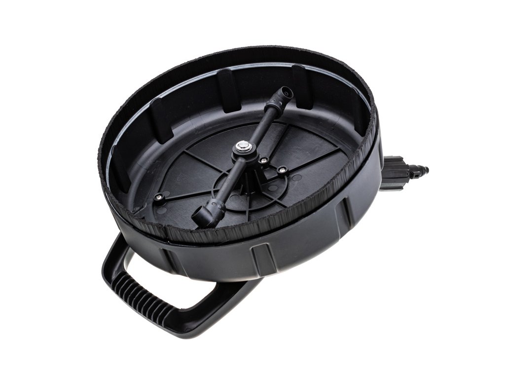 - Plochý design umožňuje rovnoměrné rozložení tlaku po celé ploše, zatímco otočné trysky uvnitř kartáče zajišťují rovnoměrné a důkladné čištění. Ergonomická rukojeť a snadné připojení k pistoli zajišťují pohodlné používání i při delším čištění.