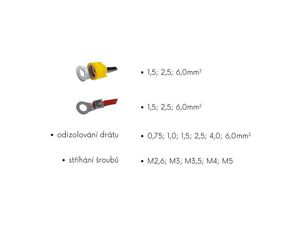 - izolované koncovky 1.5, 2.5, 6.0 mm / neizolované koncovky 1.5, 2.5, 6.0 mm / střih metrickým šroubů M2.6, M3, M3.5, M4 a M5 / odizolovávání 0.75, 1.0, 1.5, 2.5, 4.0 a 6.0 mm + B16 : B19