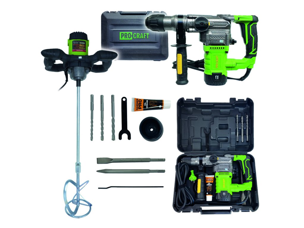 Tato praktická sada obsahuje kombinované vrtací a sekací kladivo Procraft BH1300 a míchadlo stavebních směsí PMM2000, ideální pro stavební a renovační práce.