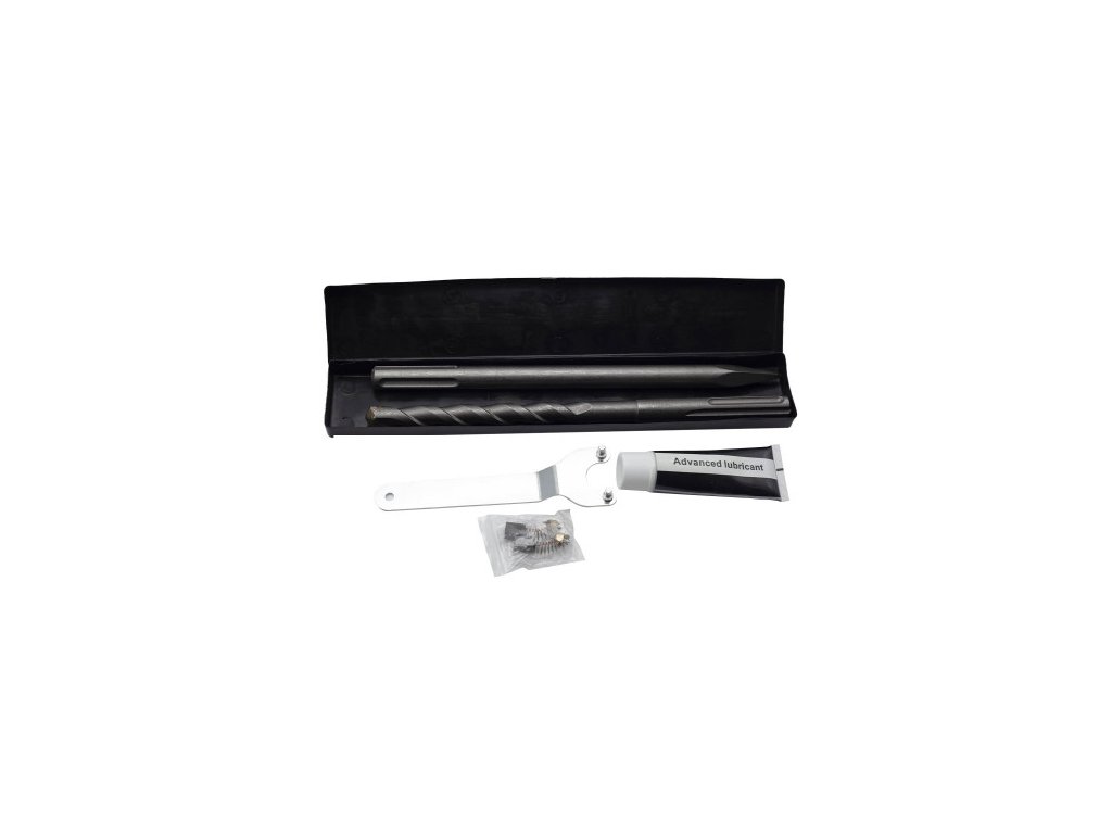 Součástí dodávky je sekáč, vrták a přepravní kufr.